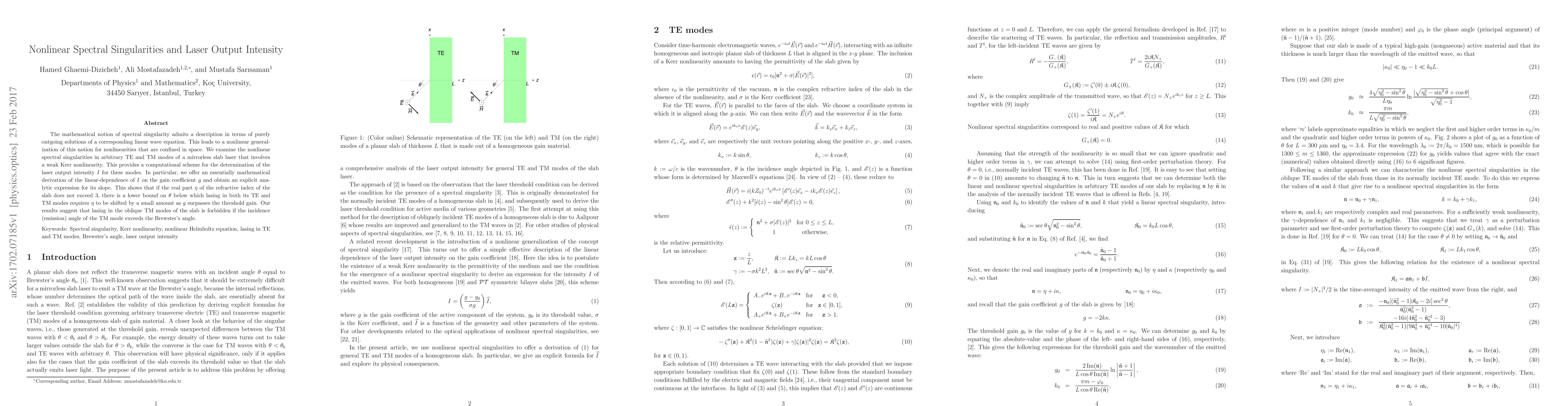 The mathematical notion of spectral singularity admits a description in terms of purely outgoing solutions of a corresponding linear wave equation. This leads to a nonlinear generalization of this notion for nonlinearities that are confined in space. We examine the nonlinear spectral singularities in arbitrary TE and TM modes of a mirrorless slab laser that involves a weak Kerr nonlinearity. This provides a computational scheme for the determination of the laser output intensity $I$ for these modes. In particular, we offer an essentially mathematical derivation of the linear-dependence of $I$ on the gain coefficient $g$ and obtain an explicit analytic expression for its slope. This shows that if the real part $\eta$ of the refractive index of the slab does not exceed 3, there is a lower bound on $\theta$ below which lasing in both its TE and TM modes requires $\eta$ to be shifted by a small amount as $g$ surpasses the threshold gain. Our results suggest that lasing in the oblique TM modes of the slab is forbidden if the incidence (emission) angle of the TM mode exceeds the Brewster's angle.