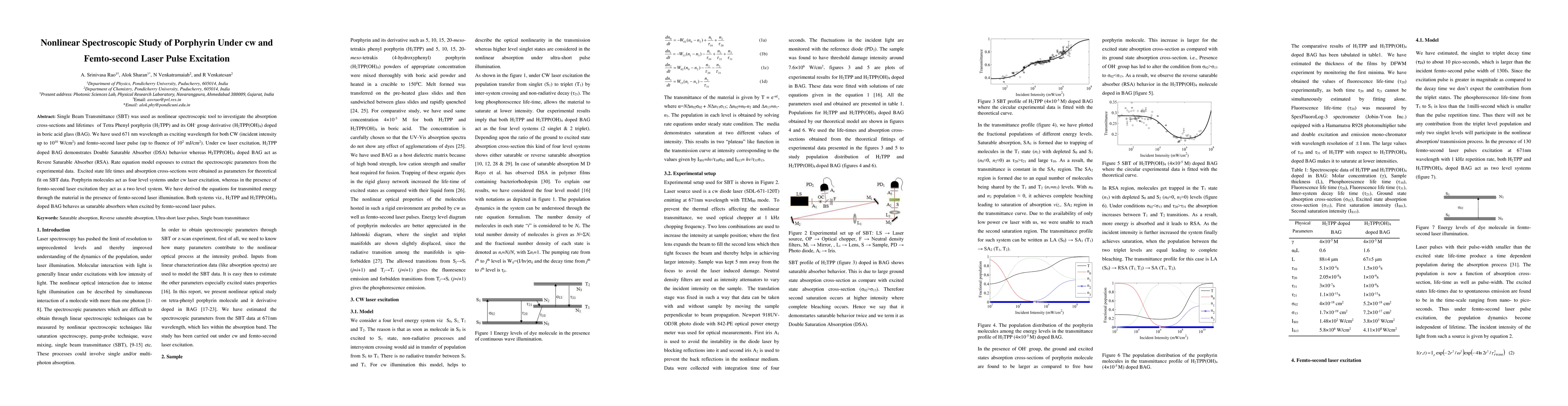 Single Beam Transmittance (SBT) was used as nonlinear spectroscopic tool to investigate the absorption cross-sections and lifetimes of Tetra Phenyl porphyrin (H2TPP) and its OH- group derivative (H2TPP(OH)4) doped in boric acid glass (BAG). We have used 671 nm wavelength as exciting wavelength for both CW (incident intensity up to 1010 W/cm2) and femto-second laser pulse (up to fluence of 102 mJ/cm2). Under cw laser excitation, H2TPP doped BAG demonstrates Double Saturable Absorber (DSA) behavior whereas H2TPP(OH)4 doped BAG act as Revere Saturable Absorber (RSA). Rate equation model espouses to extract the spectroscopic parameters from the experimental data. Excited state life times and absorption cross-sections were obtained as parameters for theoretical fit on SBT data. Porphyrin molecules act as four level systems under cw laser excitation, whereas in the presence of femto-second laser excitation they act as a two level system. We have derived the equations for transmitted energy through the material in the presence of femto-second laser illumination. Both systems viz., H2TPP and H2TPP(OH)4 doped BAG behaves as saturable absorbers when excited by femto-second laser pulses.