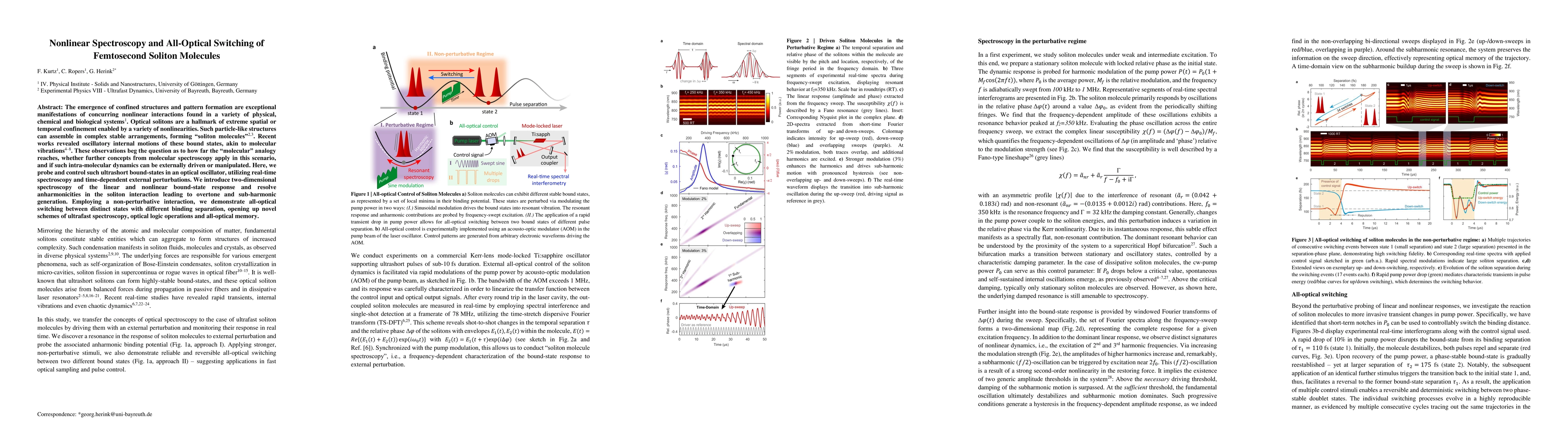This paper investigates the nonlinear spectroscopy and all-optical switching of femtosecond soliton molecules, revealing their oscillatory internal motions and demonstrating the potential for manipulating these bound states through real-time spectroscopy and external perturbations, enabling novel ultrafast optical logic operations and memory.