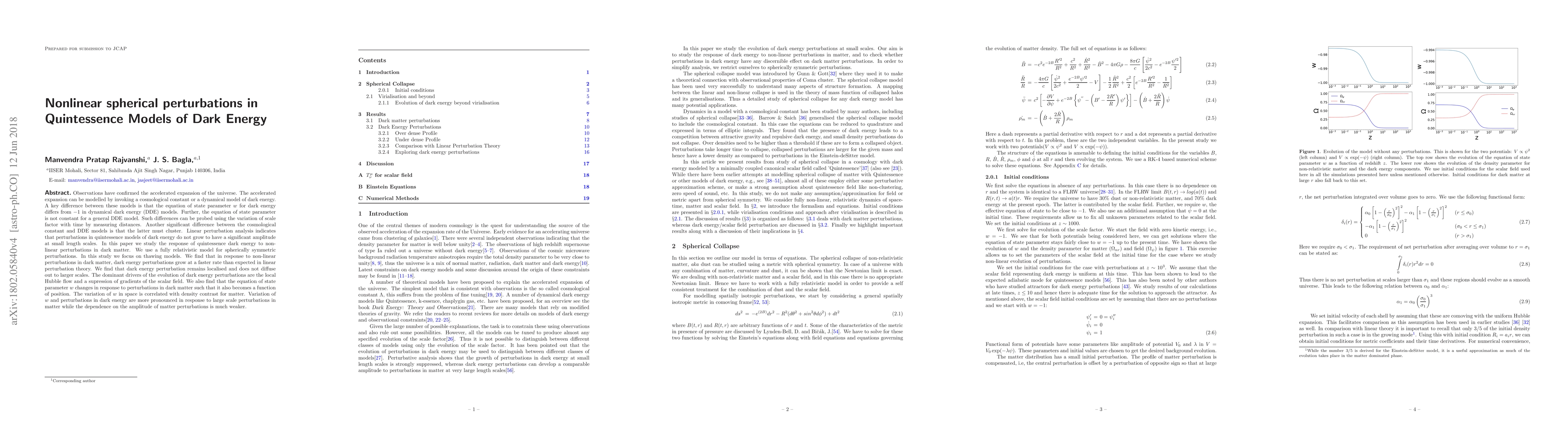 This paper investigates nonlinear spherical perturbations in quintessence models of dark energy, finding that dark energy perturbations grow faster than predicted by linear theory and remain localized. The equation of state parameter $w$ for dark energy becomes spatially dependent and correlates with matter density contrast, with larger-scale matter perturbations having a more significant effect.