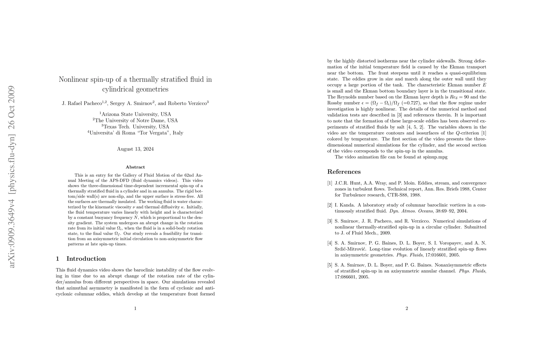 This is an entry for the Gallery of Fluid Motion of the 62nd Annual Meeting of the APS-DFD (fluid dynamics videos). This video shows the three-dimensional time-dependent incremental spin-up of a thermally stratified fluid in a cylinder and in an annulus. The rigid bottom/side wall(s) are non-slip, and the upper surface is stress-free. All the surfaces are thermally insulated. The working fluid is water characterized by the kinematic viscosity $\nu$ and thermal diffusivity $\kappa$. Initially, the fluid temperature varies linearly with height and is characterized by a constant buoyancy frequency $N$, which is proportional to the density gradient. The system undergoes an abrupt change in the rotation rate from its initial value $\Omega_i $, when the fluid is in a solid-body rotation state, to the final value $\Omega_f$. Our study reveals a feasibility for transition from an axisymmetric initial circulation to non-axisymmetric flow patterns at late spin-up times.