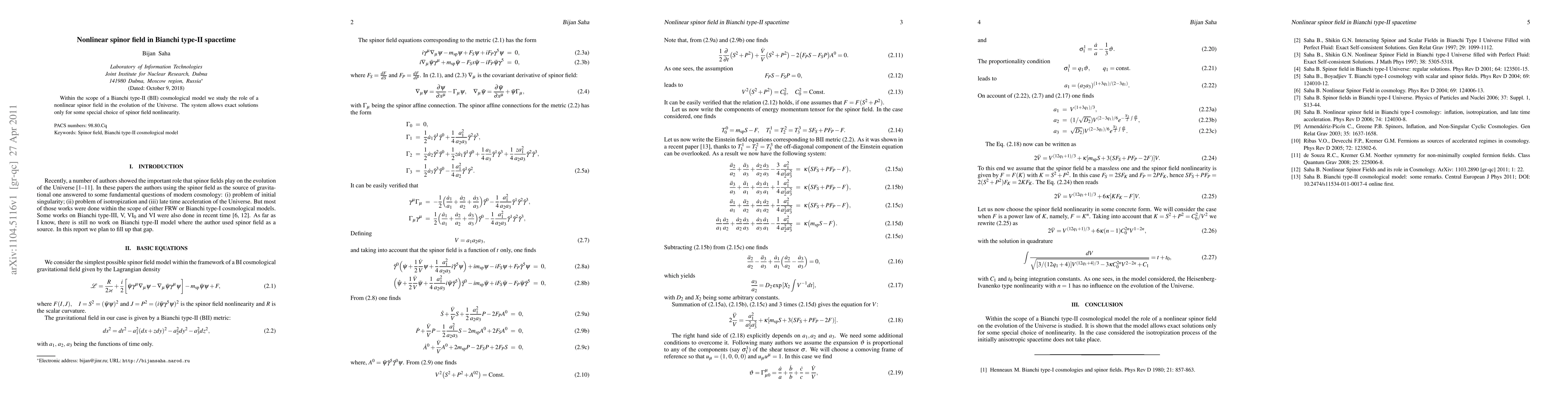 Summary: This paper investigates the influence of a nonlinear spinor field on the evolution of a Bianchi type-II cosmological model, finding that exact solutions are attainable only under specific nonlinear spinor field configurations.