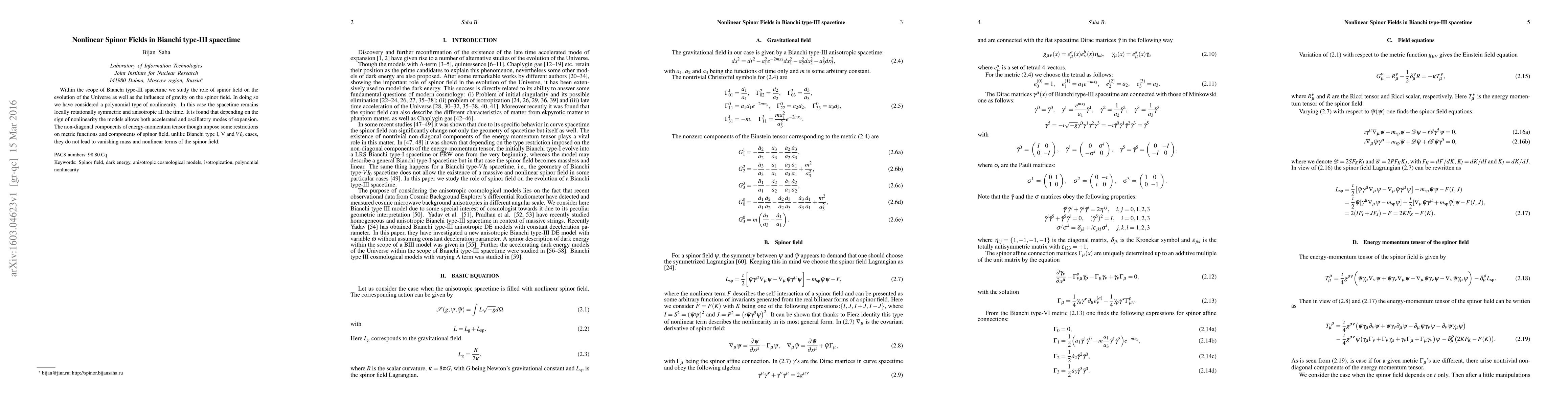 This paper investigates the impact of nonlinear spinor fields in Bianchi type-III spacetime on the universe's evolution and the influence of gravity on the spinor field. The study reveals that the sign of nonlinearity can lead to either accelerated or oscillatory expansion modes, with the non-diagonal components of the energy-momentum tensor imposing unique restrictions on the metric and spinor field components.