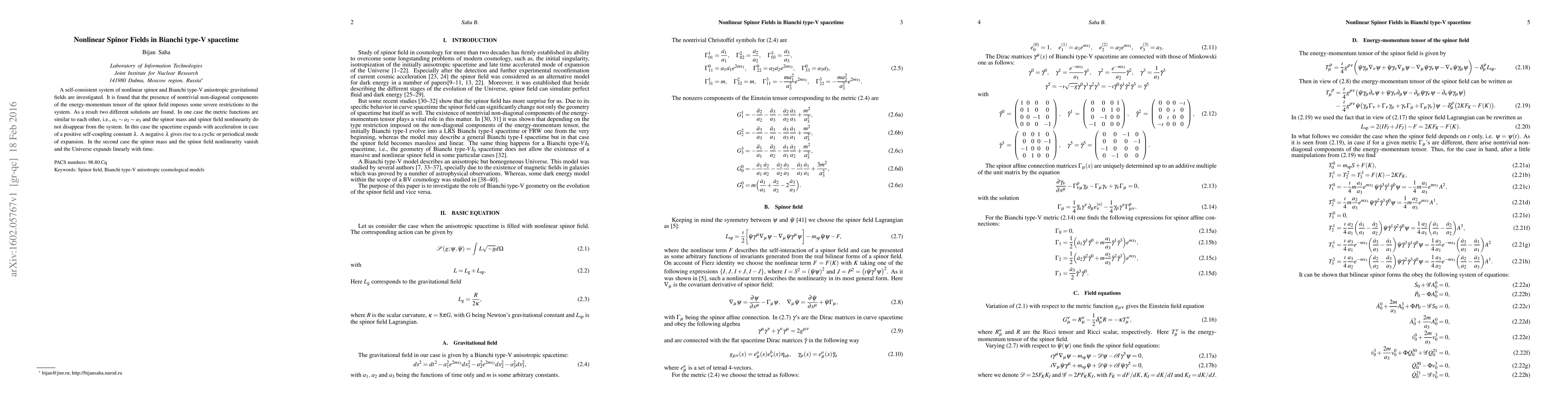 This paper investigates nonlinear spinor fields in Bianchi type-V spacetime, revealing two distinct solutions. The first solution features similar metric functions and accelerated expansion with a positive self-coupling constant, while a negative constant leads to cyclic expansion. The second solution results in linear expansion with vanishing spinor mass and nonlinearity.