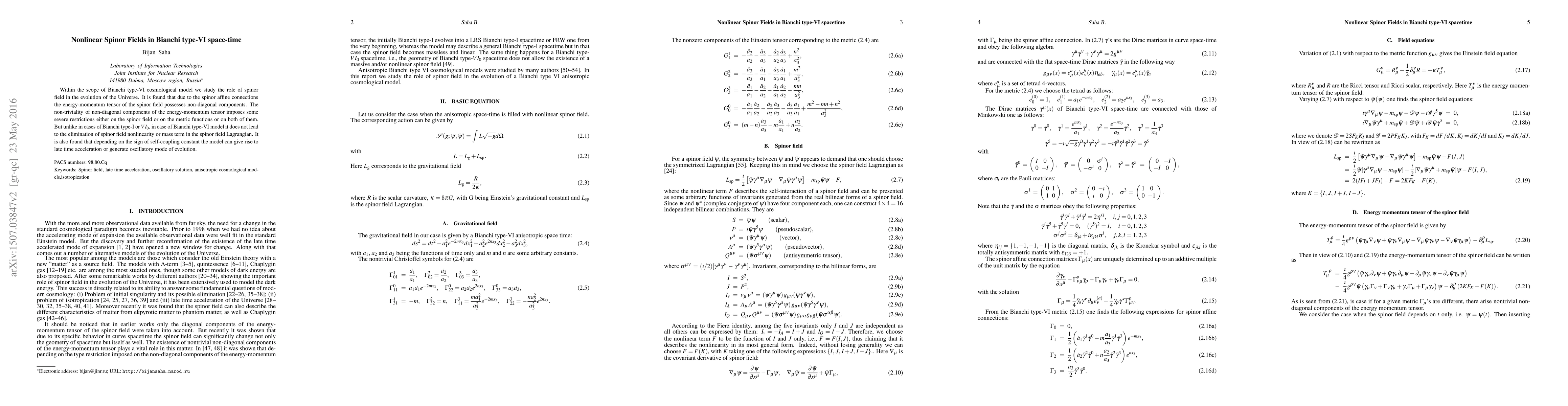 This paper investigates the influence of spinor fields in a Bianchi type-VI cosmological model, revealing that spinor affine connections lead to non-diagonal components in the energy-momentum tensor, imposing constraints on the spinor field or metric functions. Unlike other Bianchi types, this model retains spinor field nonlinearity and mass terms, potentially resulting in late-time acceleration or oscillatory evolution depending on the self-coupling constant.