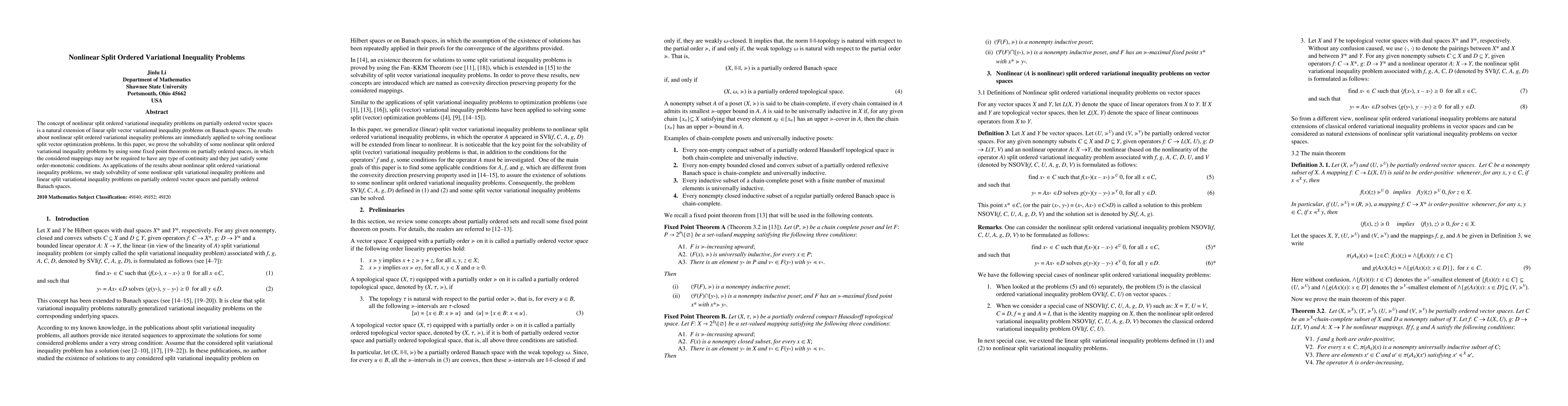 The concept of nonlinear split ordered variational inequality problems on partially ordered vector spaces is a natural extension of linear split vector variational inequality problems on Banach spaces. The results about nonlinear split ordered variational inequality problems are immediately applied to solving nonlinear split vector optimization problems. In this paper, we prove the solvability of some nonlinear split ordered variational inequality problems by using some fixed point theorems on partially ordered spaces, in which the considered mappings may not be required to have any type of continuity and they just satisfy some order-monotonic conditions. As applications of the results about nonlinear split ordered variational inequality problems, we study solvability of some nonlinear split variational inequality problems and linear split variational inequality problems on partially ordered vector spaces and partially ordered Banach spaces.