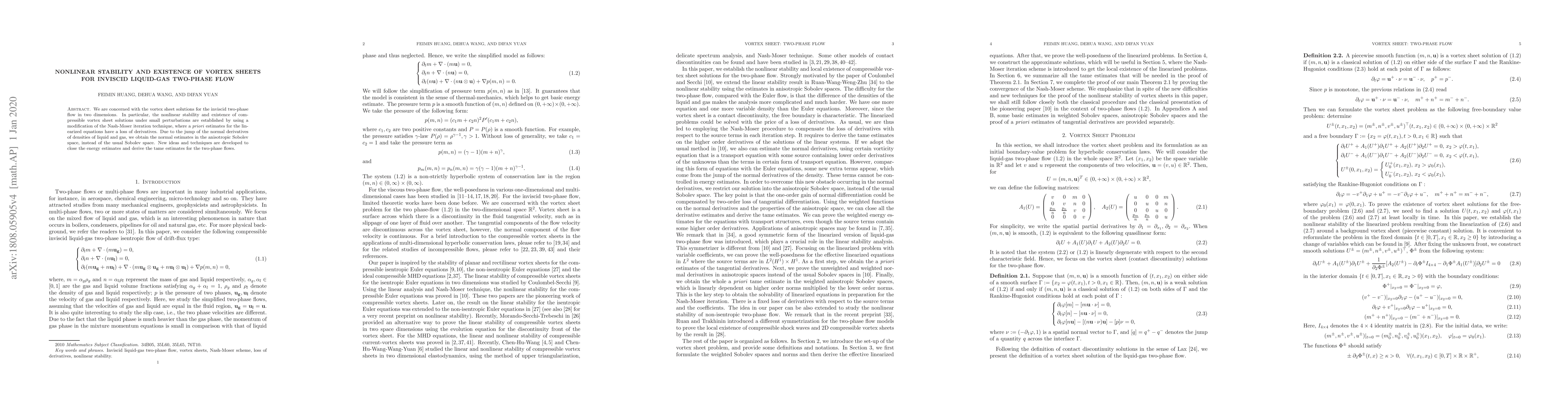 Researchers investigate the stability of vortex sheets in inviscid liquid-gas two-phase flow using a modified Nash-Moser iteration technique, establishing nonlinear stability and existence under small perturbations.