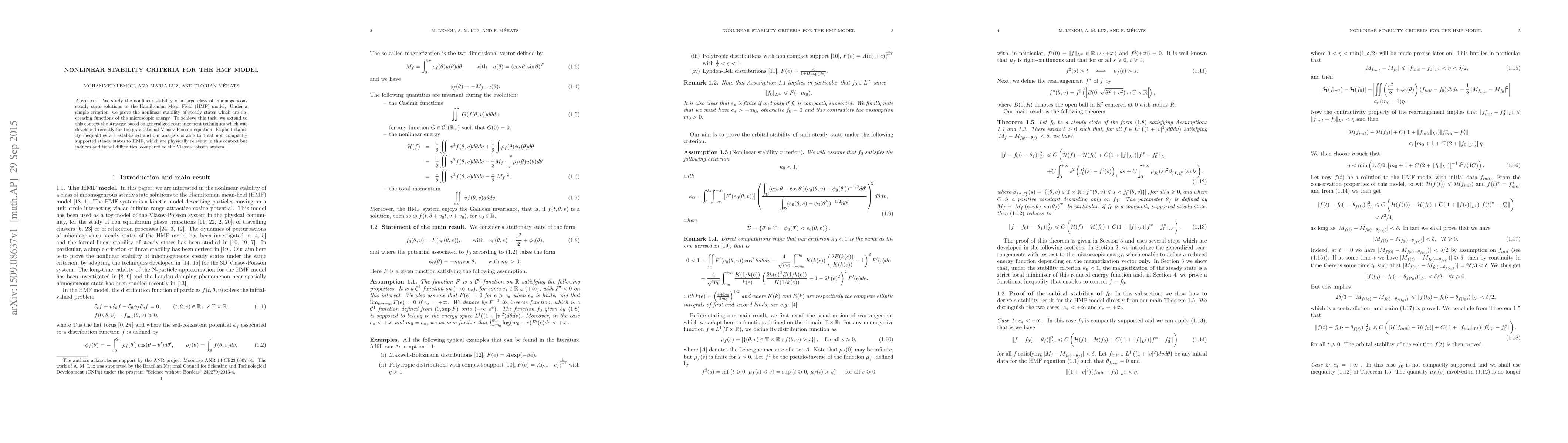 This paper investigates the nonlinear stability of inhomogeneous steady states in the Hamiltonian Mean Field (HMF) model, proving stability for decreasing functions of microscopic energy. The authors extend generalized rearrangement techniques to establish explicit stability inequalities, addressing the additional complexities of non-compactly supported steady states.