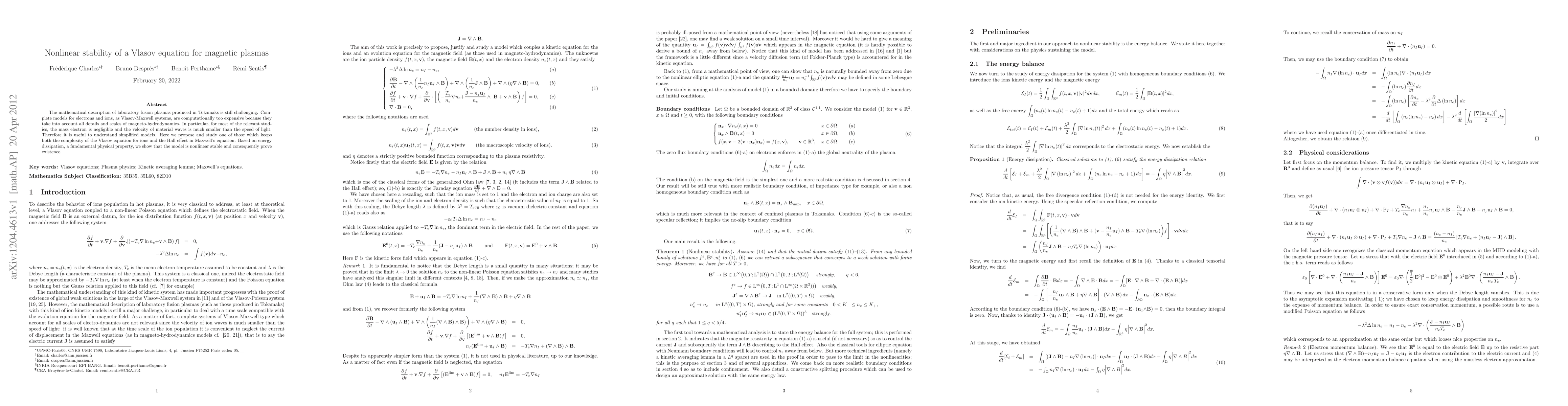 The mathematical description of laboratory fusion plasmas produced in Tokamaks is still challenging. Complete models for electrons and ions, as Vlasov-Maxwell systems, are computationally too expensive because they take into account all details and scales of magneto-hydrodynamics. In particular, for most of the relevant studies, the mass electron is negligible and the velocity of material waves is much smaller than the speed of light. Therefore it is useful to understand simplified models. Here we propose and study one of those which keeps both the complexity of the Vlasov equation for ions and the Hall effect in Maxwell's equation. Based on energy dissipation, a fundamental physical property, we show that the model is nonlinear stable and consequently prove existence.