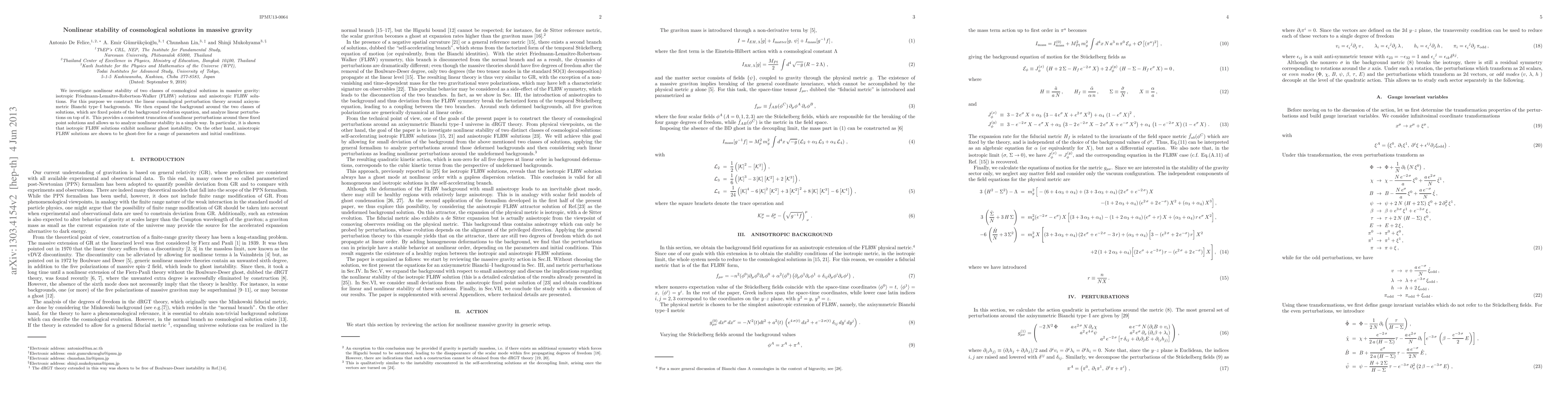 We investigate nonlinear stability of two classes of cosmological solutions in massive gravity: isotropic Friedmann-Lemaitre-Robertson-Walker (FLRW) solutions and anisotropic FLRW solutions. For this purpose we construct the linear cosmological perturbation theory around axisymmetric Bianchi type--I backgrounds. We then expand the background around the two classes of solutions, which are fixed points of the background evolution equation, and analyze linear perturbations on top of it. This provides a consistent truncation of nonlinear perturbations around these fixed point solutions and allows us to analyze nonlinear stability in a simple way. In particular, it is shown that isotropic FLRW solutions exhibit nonlinear ghost instability. On the other hand, anisotropic FLRW solutions are shown to be ghost-free for a range of parameters and initial conditions.