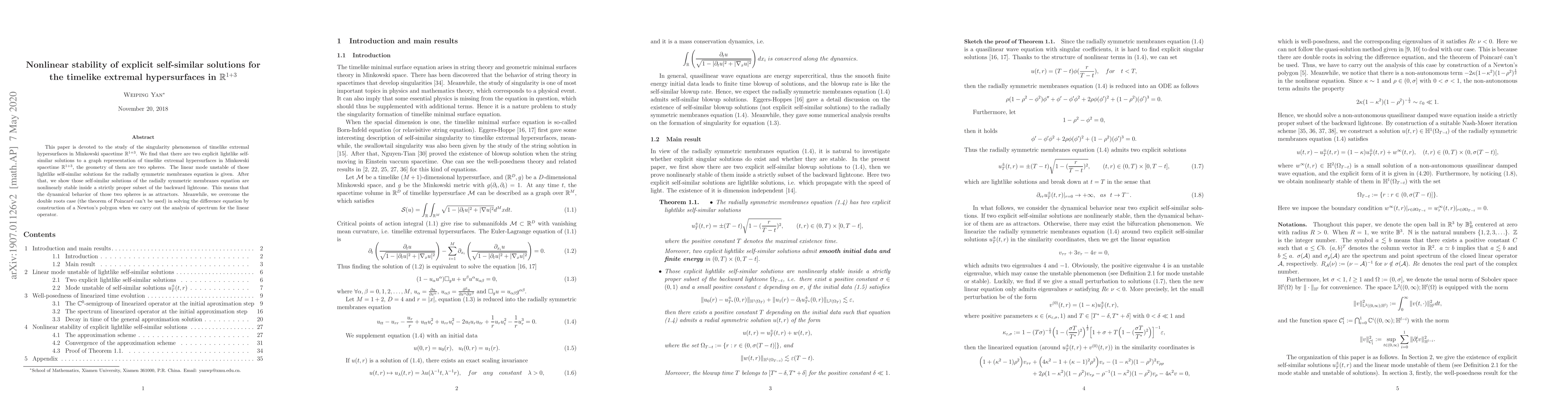 This paper investigates the nonlinear stability of explicit self-similar solutions for timelike extremal hypersurfaces in Minkowski spacetime, finding two lightlike self-similar spherical solutions that are nonlinearly stable within a specific subset of the backward lightcone, despite linear mode instability.