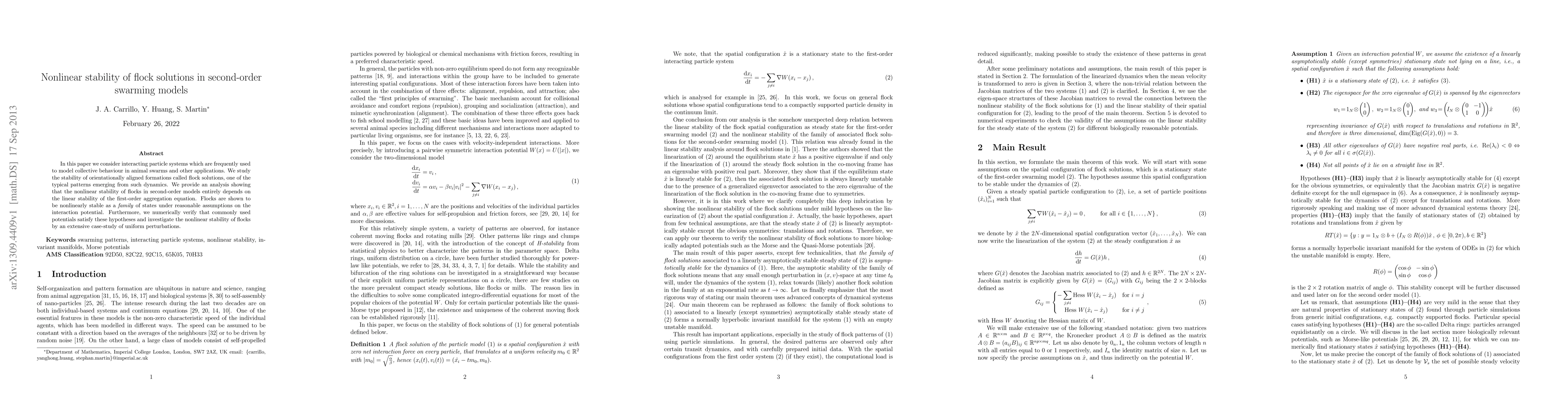In this paper we consider interacting particle systems which are frequently used to model collective behavior in animal swarms and other applications. We study the stability of orientationally aligned formations called flock solutions, one of the typical patterns emerging from such dynamics. We provide an analysis showing that the nonlinear stability of flocks in second-order models entirely depends on the linear stability of the first-order aggregation equation. Flocks are shown to be nonlinearly stable as a family of states under reasonable assumptions on the interaction potential. Furthermore, we numerically verify that commonly used potentials satisfy these hypotheses and investigate the nonlinear stability of flocks by an extensive case-study of uniform perturbations.