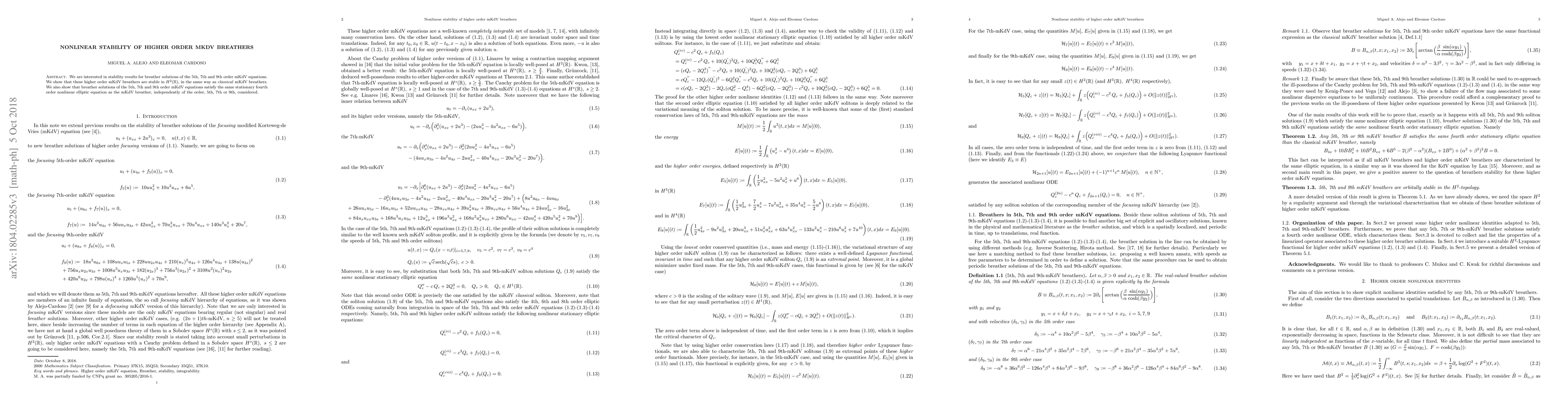 Higher-order mKdV breathers of different orders (5th, 7th, 9th) exhibit the same stability properties as classical mKdV breathers in $H^2( extrm{R})$, sharing a common stationary nonlinear elliptic equation.