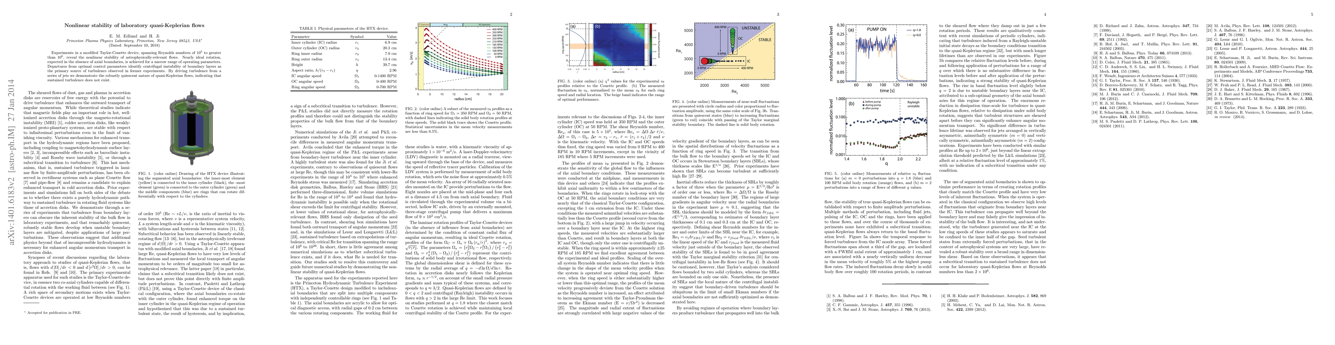 This paper investigates the nonlinear stability of quasi-Keplerian flows in a modified Taylor-Couette device, finding that nearly ideal rotation occurs within a narrow parameter range. The study identifies centrifugal instability in boundary layers as the main turbulence source, demonstrating that quasi-Keplerian flows remain quiescent when driven by turbulence.