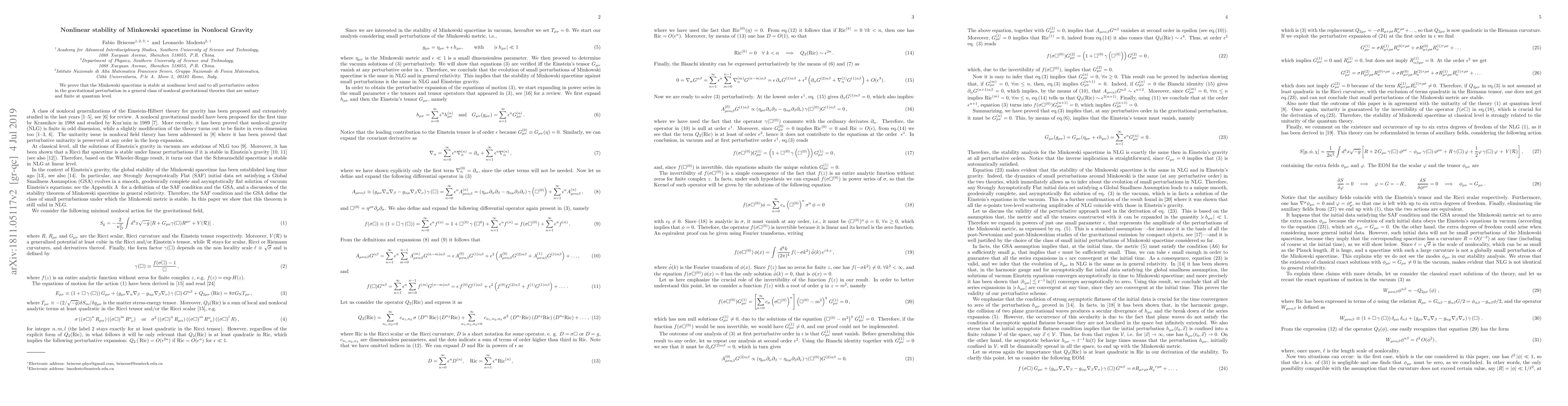 Summary: This paper demonstrates the nonlinear stability of Minkowski spacetime under gravitational perturbations in a broad class of nonlocal gravity theories, ensuring unitary and finite quantum behavior. The stability holds to all perturbative orders.