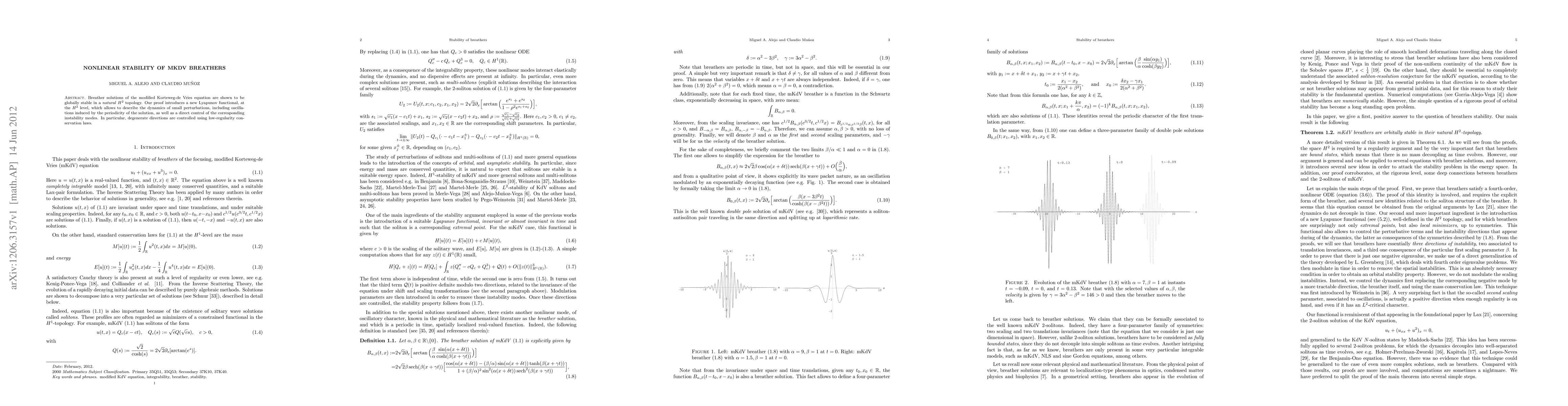 Breather solutions of the modified Korteweg-de Vries equation are shown to be globally stable in a natural H^2 topology. Our proof introduces a new Lyapunov functional, at the H^2 level, which allows to describe the dynamics of small perturbations, including oscillations induced by the periodicity of the solution, as well as a direct control of the corresponding instability modes. In particular, degenerate directions are controlled using low-regularity conservation laws.