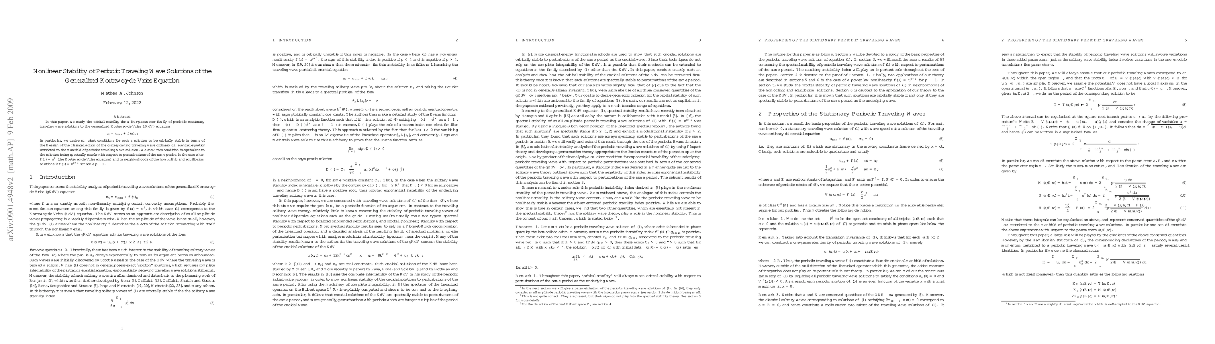 This paper investigates the orbital stability of periodic traveling wave solutions to the generalized Korteweg-de Vries equation, deriving sufficient conditions for stability in terms of the Hessian of the classical action. It demonstrates that these conditions are equivalent to spectral stability for perturbations of the same period.