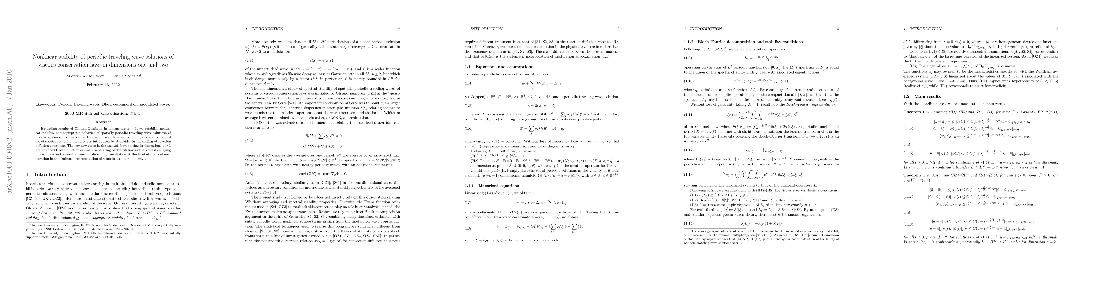 This paper establishes nonlinear stability and asymptotic behavior for spatially-periodic traveling wave solutions of viscous conservation laws in dimensions one and two, extending previous results for higher dimensions. The analysis introduces refined techniques to handle the unique challenges of lower dimensions.