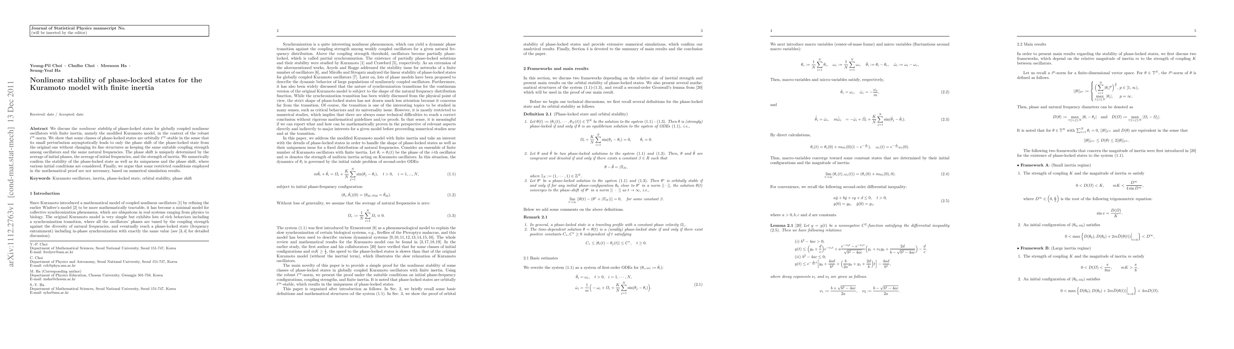 This paper investigates the nonlinear stability of phase-locked states in the modified Kuramoto model with finite inertia, demonstrating that certain states are orbitally stable under small perturbations. Numerical simulations confirm the stability, uniqueness, and specific phase shift determined by initial conditions and inertia strength.