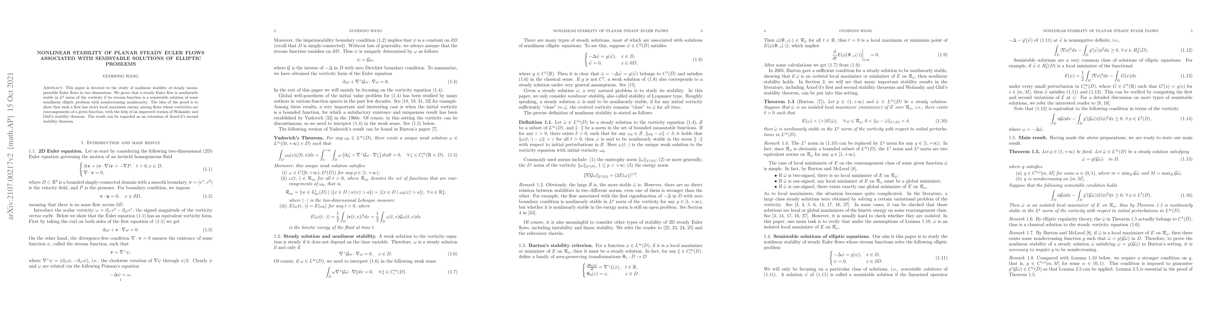 This research establishes that certain 2D, incompressible Euler flow stabilities, characterized by semistable stream functions, can be linked to solutions of specific semilinear elliptic problems. The proof utilizes an enhanced version of Wolansky and Ghil's theorem, demonstrating these flows' local energy maximum property among rearranged vorticity functions, extending Arnol'd' second stability theorem.