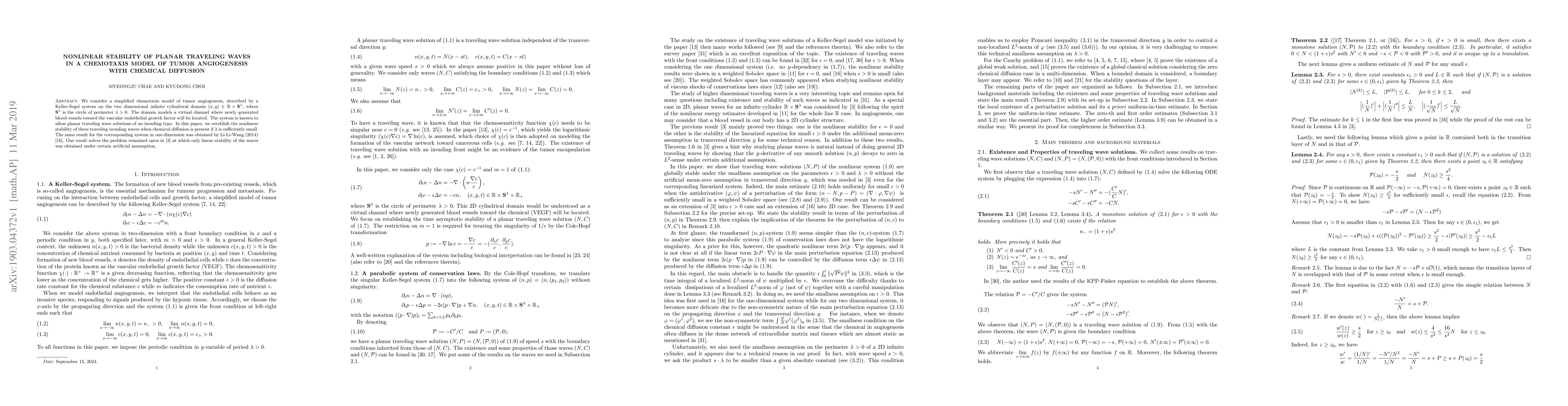 This paper investigates the nonlinear stability of planar traveling waves in a chemotaxis model for tumor angiogenesis, showing that these waves remain stable under chemical diffusion when the domain's circumference is sufficiently small. This extends the results from a one-dimensional system, resolving the open problem of nonlinear stability without artificial assumptions.