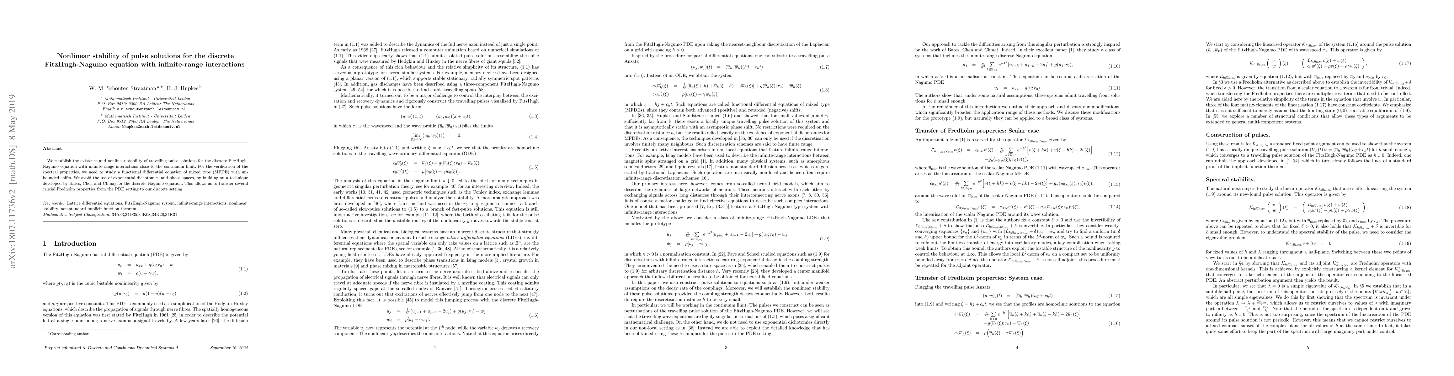 This paper establishes the existence and nonlinear stability of travelling pulse solutions for the discrete FitzHugh-Nagumo equation with infinite-range interactions near the continuum limit. It employs a novel technique to verify spectral properties without using exponential dichotomies, transferring Fredholm properties from the PDE setting to the discrete setting.