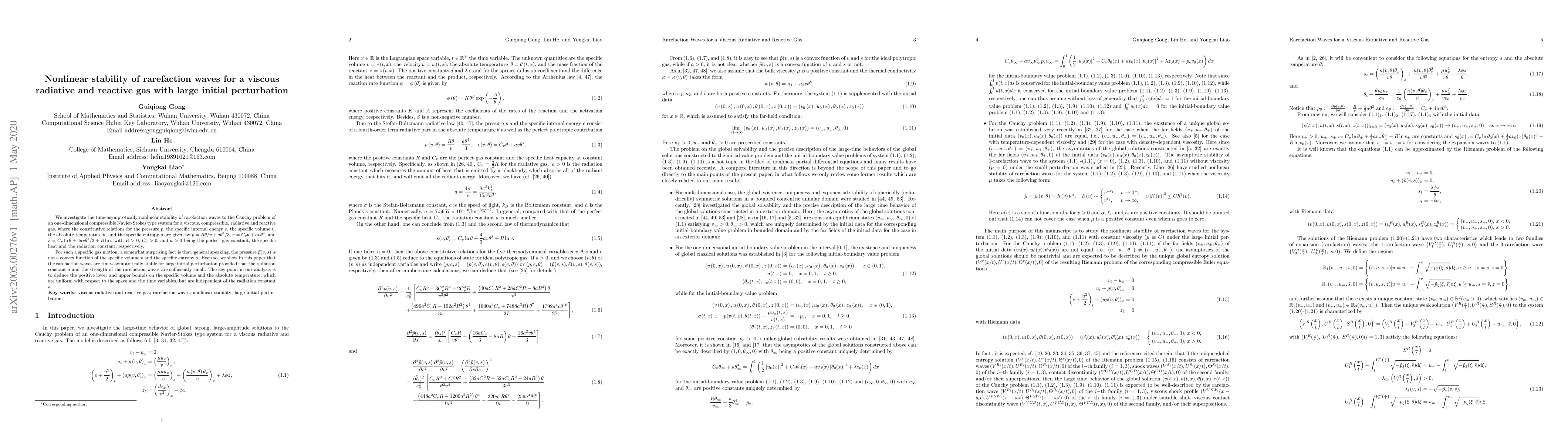 This paper investigates the nonlinear stability of rarefaction waves for a viscous, radiative, and reactive gas under large initial perturbations. Despite the pressure not being a convex function of specific volume and entropy, the authors demonstrate that rarefaction waves remain stable when the radiation constant and wave strength are sufficiently small.