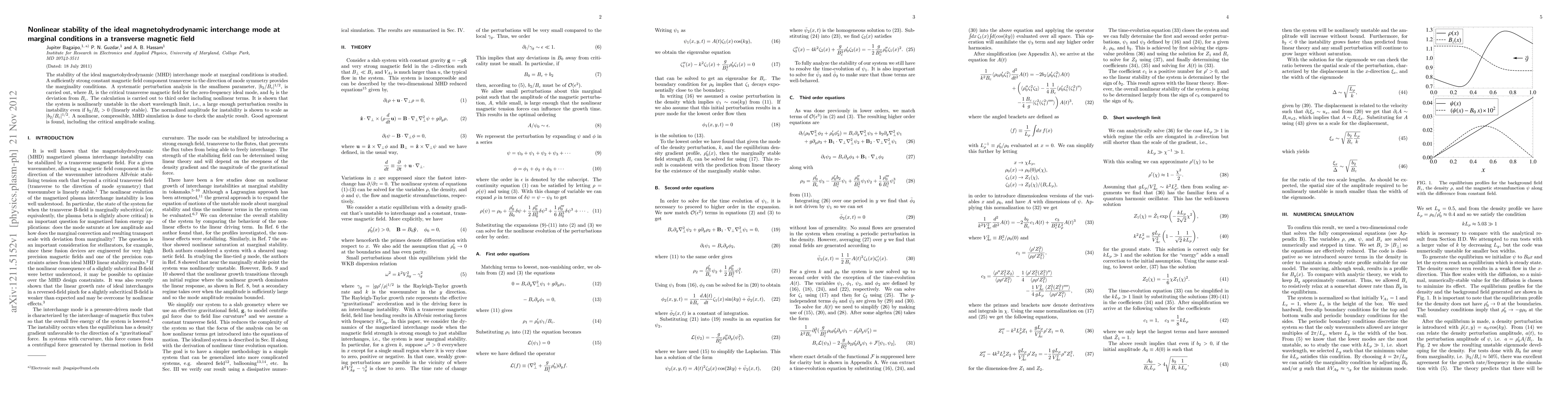 The stability of the ideal magnetohydrodynamic (MHD) interchange mode at marginal conditions is studied. A sufficiently strong constant magnetic field component transverse to the direction of mode symmetry provides the marginality conditions. A systematic perturbation analysis in the smallness parameter, $|b_2/B_c|^{1/2}$, is carried out, where $B_c$ is the critical transverse magnetic field for the zero-frequency ideal mode, and $b_2$ is the deviation from $B_c$. The calculation is carried out to third order including nonlinear terms. It is shown that the system is nonlinearly unstable in the short wavelength limit, i.e., a large enough perturbation results in instability even if $b_2/B_c>0$ (linearly stable). The normalized amplitude for instability is shown to scale as $|b_2/B_c|^{1/2}$. A nonlinear, compressible, MHD simulation is done to check the analytic result. Good agreement is found, including the critical amplitude scaling.