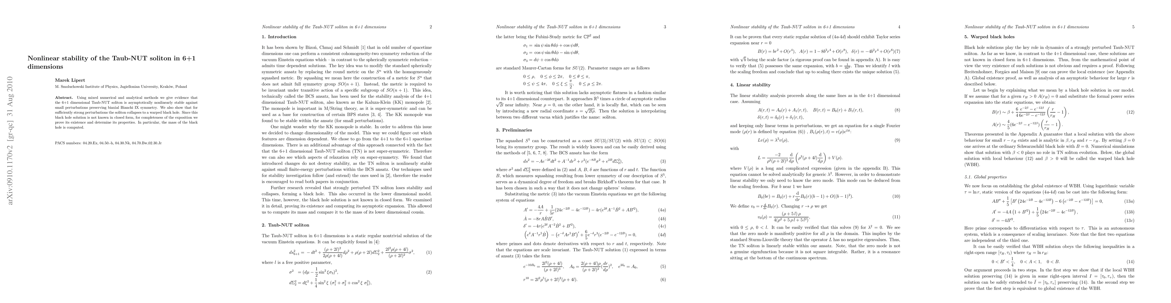 The 6+1 dimensional Taub-NUT soliton is asymptotically nonlinearly stable against small perturbations, but collapses to a warped black hole for strong enough disturbances.