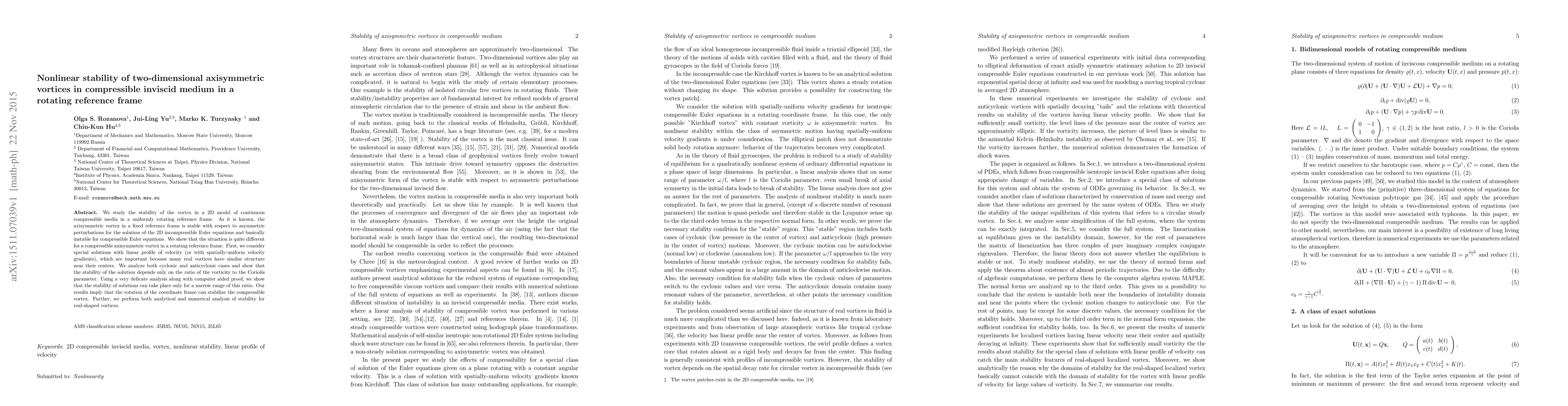 This paper investigates the nonlinear stability of two-dimensional axisymmetric vortices in a compressible inviscid medium within a rotating reference frame. It finds that rotation can stabilize these vortices, contrasting their instability in a fixed frame, and identifies a narrow range of vorticity-to-Coriolis parameter ratios where stability occurs.