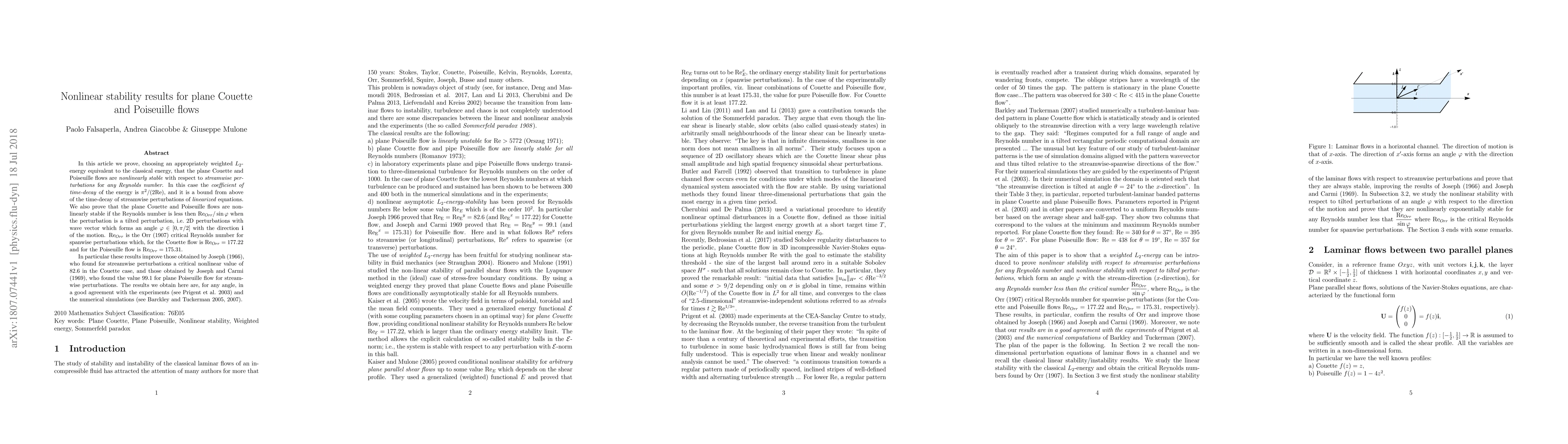 In this article we prove, choosing an appropriately weighted $L_2$-energy equivalent to the classical energy, that the plane Couette and Poiseuille flows are nonlinearly stable with respect to streamwise perturbations for any Reynolds number. In this case the coefficient of time-decay of the energy is $\pi^2/(2 {\rm Re})$, and it is a bound from above of the time-decay of streamwise perturbations of linearized equations. We also prove that the plane Couette and Poiseuille flows are nonlinearly stable if the Reynolds number is less then ${\rm Re}_{Orr}/\sin \varphi$ when the perturbation is a tilted perturbation, i.e. 2D perturbations with wave vector which forms an angle $\varphi \in [0, \pi/2]$ with the direction ${\bf i}$ of the motion. ${\rm Re}_{Orr}$ is the Orr (1907) critical Reynolds number for spanwise perturbations which, for the Couette flow is ${\rm Re}_{Orr}=177.22$ and for the Poiseuille flow is ${\rm Re}_{Orr}=175.31$. In particular these results improve those obtained by Joseph (1966), who found for streamwise perturbations a critical nonlinear value of $82.6$ in the Couette case, and those obtained by Joseph and Carmi (1969), who found the value $99.1$ for plane Poiseuille flow for streamwise perturbations. The results we obtain here are, for any angle, in a good agreement with the experiments (see Prigent et al. 2003) and the numerical simulations (see Barckley and Tuckerman 2005, 2007).