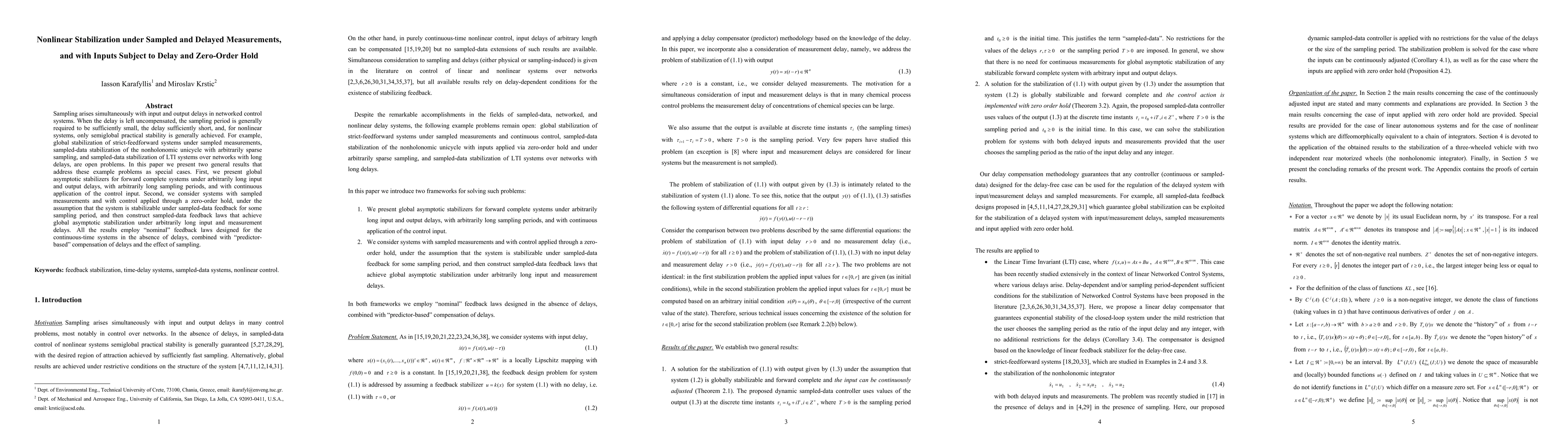 This paper presents two general results on global asymptotic stabilization of networked control systems with input/output delays and sampled measurements, addressing long-standing open problems in the field. It provides a framework for designing feedback laws that achieve global asymptotic stability under arbitrarily long delays and sampling periods.