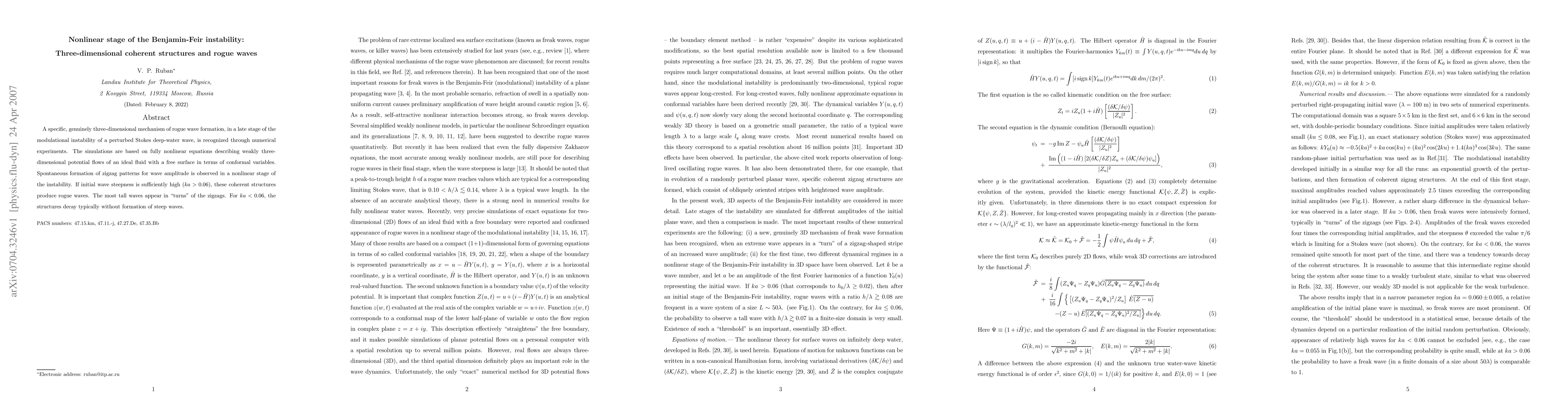 This research identifies a three-dimensional mechanism for rogue wave formation in the late stage of Benjamin-Feir instability using numerical simulations based on fully nonlinear potential flow equations. The study reveals the spontaneous emergence of zigzag patterns in wave amplitude, leading to rogue waves when initial wave steepness is high ($ka>0.06$).