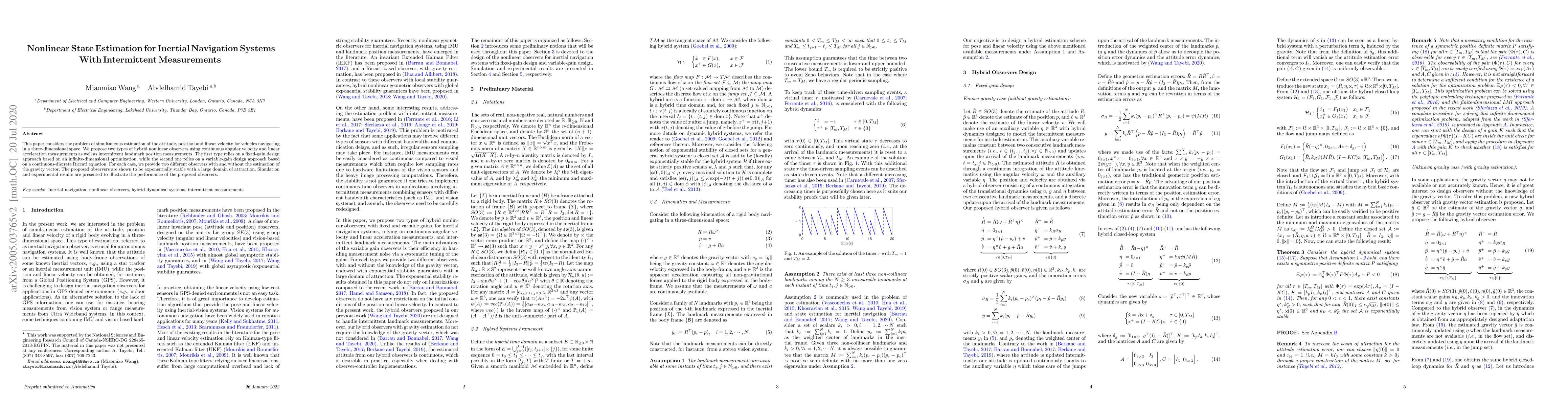 This paper proposes two hybrid nonlinear observers for estimating attitude, position, and velocity in inertial navigation systems using continuous and intermittent measurements. The observers employ fixed-gain and variable-gain designs, respectively, and are shown to be exponentially stable with extensive simulations and experiments validating their performance.