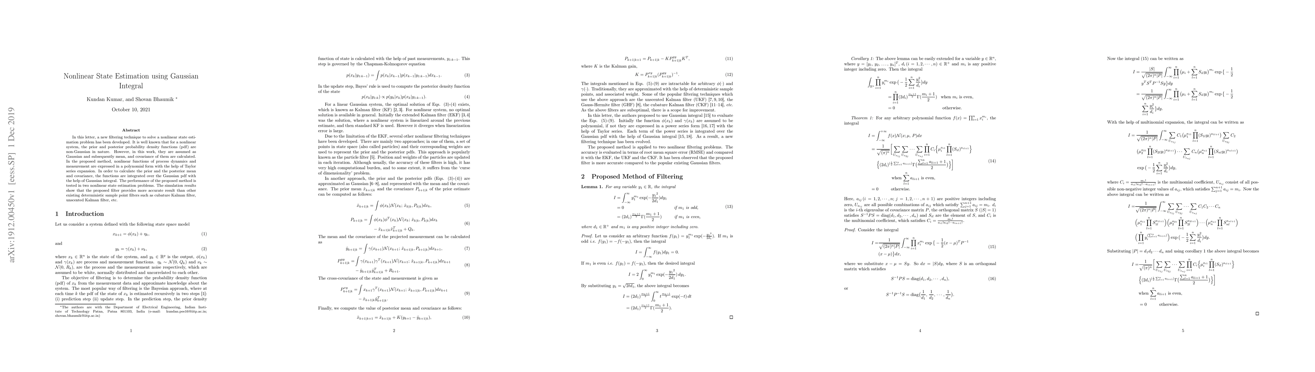 A new filtering technique for nonlinear state estimation is proposed by assuming Gaussian prior and posterior probability density functions and integrating them using Gaussian integral. The method outperforms existing filters in two nonlinear state estimation problems.