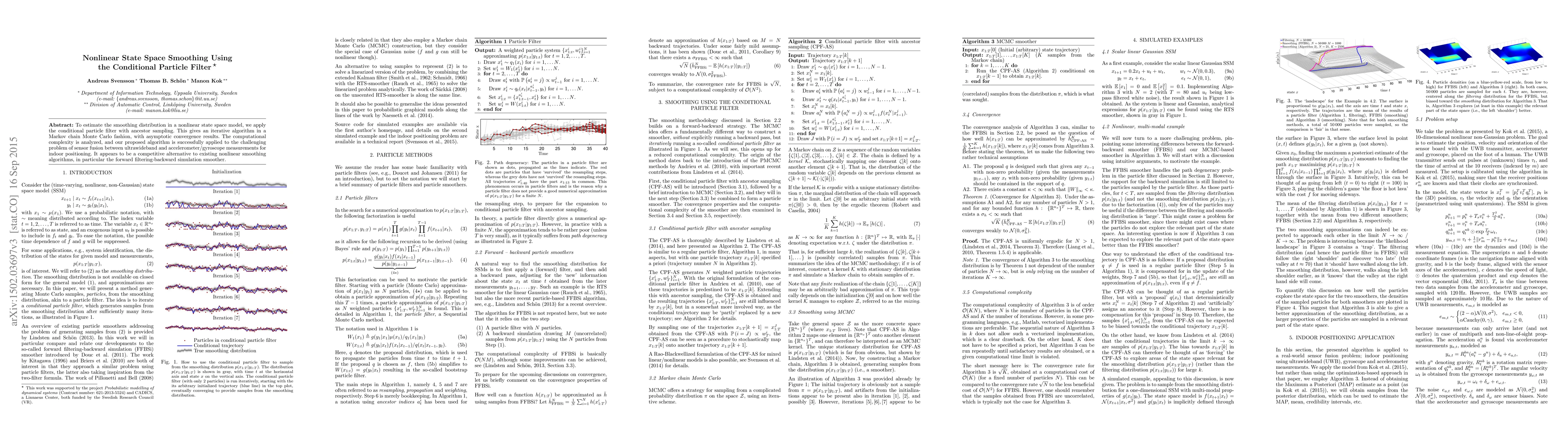 This paper proposes a conditional particle filter with ancestor sampling for nonlinear state space smoothing, demonstrating its effectiveness in sensor fusion for indoor positioning, and showing competitive performance against the forward filtering-backward simulation smoother. The computational complexity is analyzed, and the algorithm achieves asymptotic convergence.