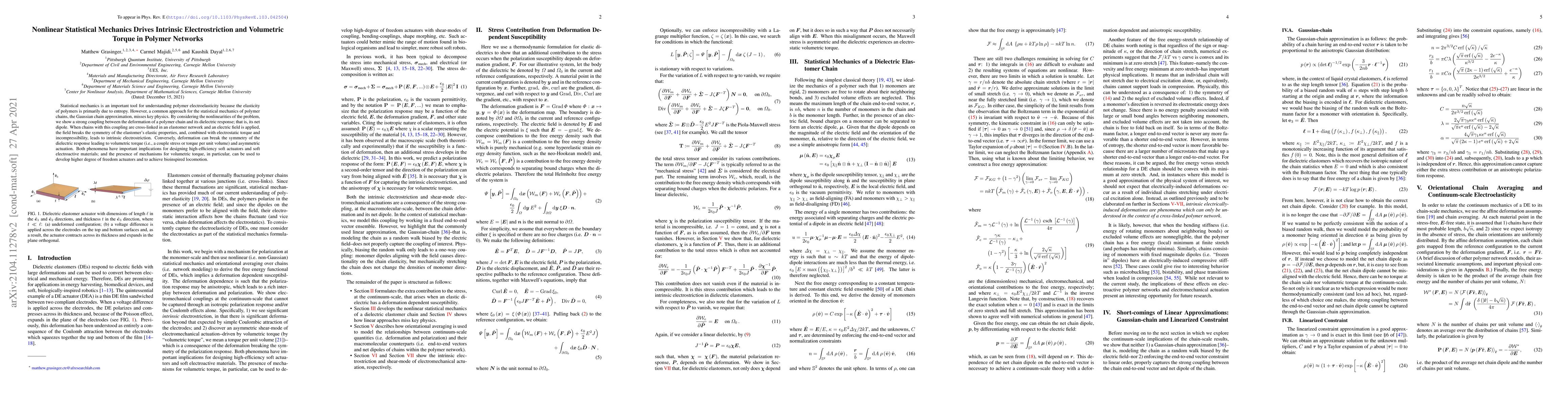 This paper demonstrates that nonlinear statistical mechanics reveals intrinsic electrostriction and volumetric torque in polymer networks, driven by the coupling between polymer deformation and dielectric response. These findings are crucial for designing advanced soft actuators and electroactive materials with enhanced efficiency and degrees of freedom.