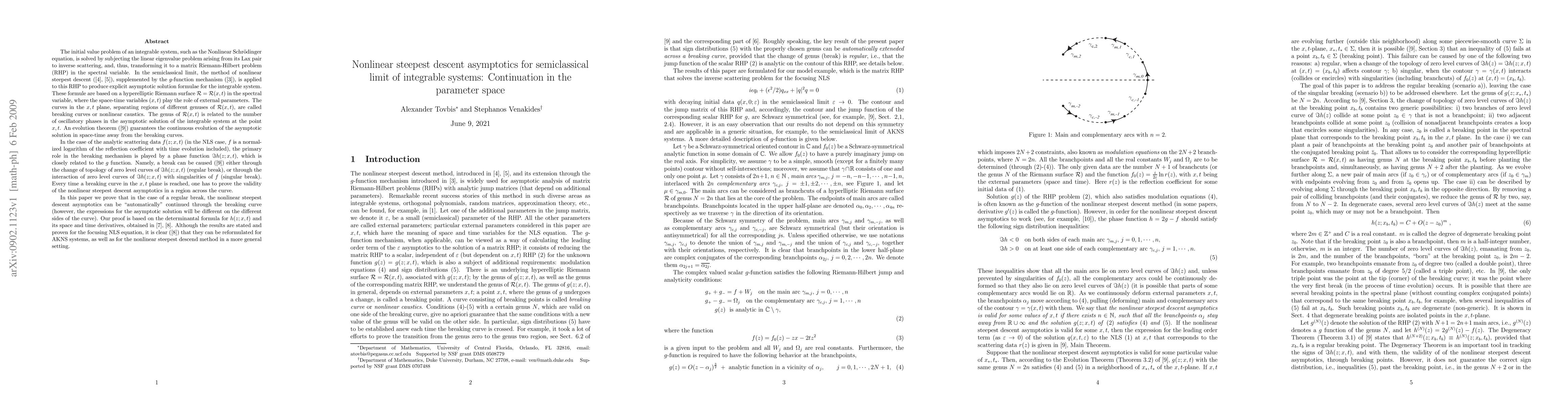 This paper explores the application of nonlinear steepest descent methods to the semiclassical limit of integrable systems, specifically the Nonlinear Schrödinger equation. It demonstrates how asymptotic solutions can be continued across breaking curves in the parameter space, maintaining different expressions on either side. The results are shown for the focusing NLS equation but are applicable to broader systems like AKNS systems.
