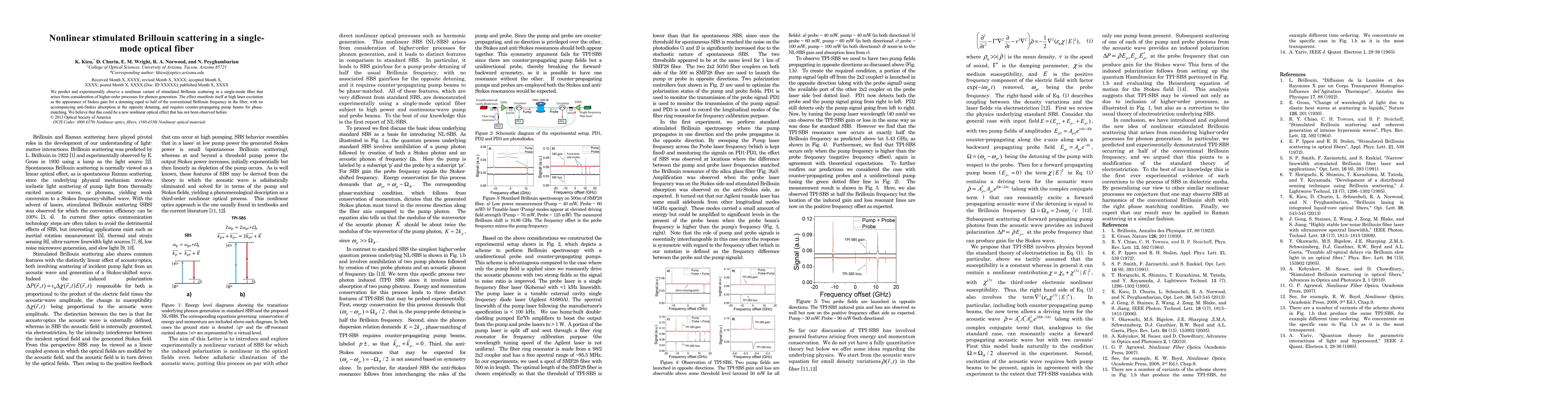 We predict and experimentally observe a nonlinear variant of stimulated Brillouin scattering in a single-mode fiber that arises from consideration of higher-order processes for phonon generation. The effect manifests itself at high laser excitation as the appearance of Stokes gain for a detuning equal to half of the conventional Brillouin frequency in the fiber, with no accompanying anti-Stokes absorption at the opposite detuning, and requires counter-propagating pump beams for phase-matching. We believe that this could be a new nonlinear optical effect that has not been observed before.