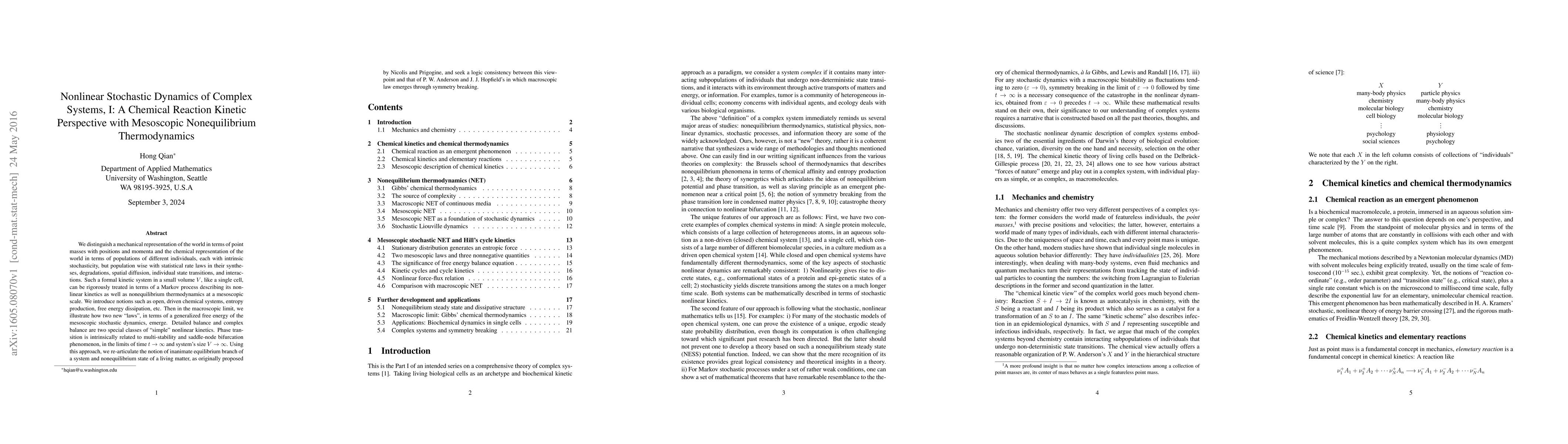 This paper explores the nonlinear stochastic dynamics of complex chemical systems using a mesoscopic nonequilibrium thermodynamics framework. It introduces concepts like open, driven chemical systems, entropy production, and free energy dissipation, and discusses the emergence of generalized free energy laws in the macroscopic limit, linking phase transitions to multi-stability and bifurcation phenomena.