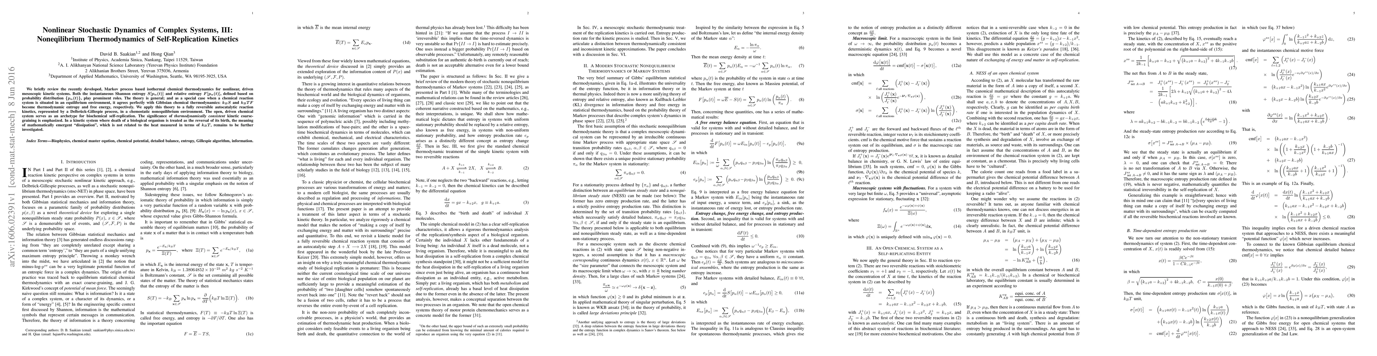 We briefly review the recently developed, Markov process based isothermal chemical thermodynamics for nonlinear, driven mesoscopic kinetic systems. Both the instantaneous Shannon entropy {\boldmath $S[p_{\alpha}(t)]$} and relative entropy {\boldmath $F[p_{\alpha}(t)]$}, defined based on probability distribution {\boldmath $\{p_{\alpha}(t)\}$}, play prominent roles. The theory is general; and as a special case when a chemical reaction system is situated in an equilibrium environment, it agrees perfectly with Gibbsian chemical thermodynamics: {\boldmath $k_BS$} and {\boldmath $k_BTF$} become thermodynamic entropy and free energy, respectively. We apply this theory to a fully reversible autocatalytic reaction kinetics, represented by a Delbr\"{u}ck-Gillespie process, in a chemostatic nonequilibrium environment. The open, driven chemical system serves as an archetype for biochemical self-replication. The significance of {\em thermodynamically consistent} kinetic coarse-graining is emphasized. In a kinetic system where death of a biological organism is treated as the reversal of its birth, the meaning of mathematically emergent "dissipation", which is not related to the heat measured in terms of {\boldmath $k_BT$}, remains to be further investigated.