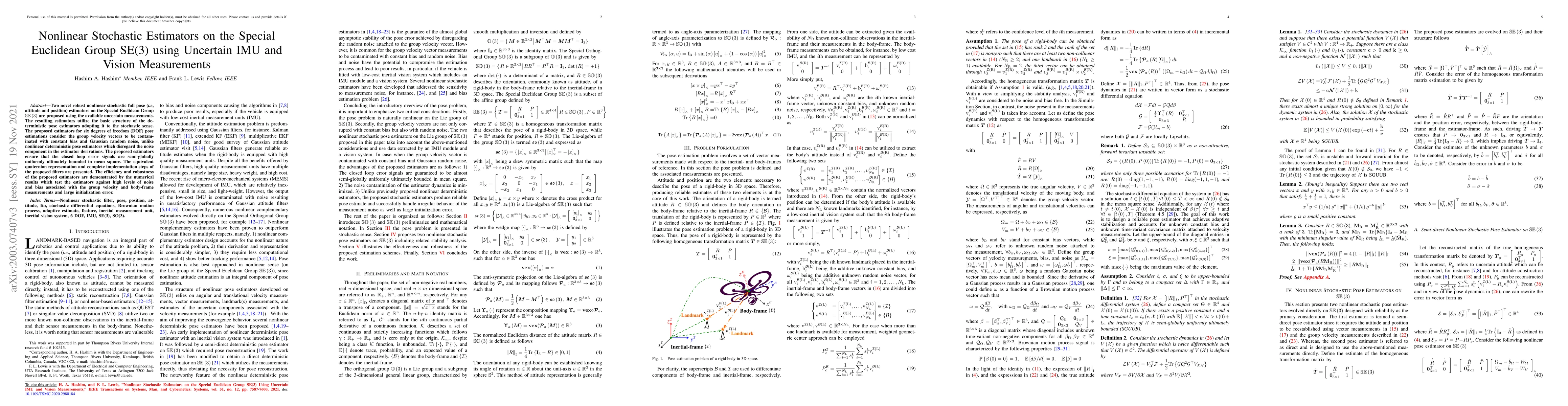 This paper proposes two robust nonlinear stochastic estimators for full pose estimation on the Special Euclidean Group SE(3), incorporating uncertain IMU and vision measurements. The estimators account for constant bias and Gaussian noise in measurements, ensuring semi-globally bounded error signals, and are demonstrated through robust numerical results against high noise and bias levels.