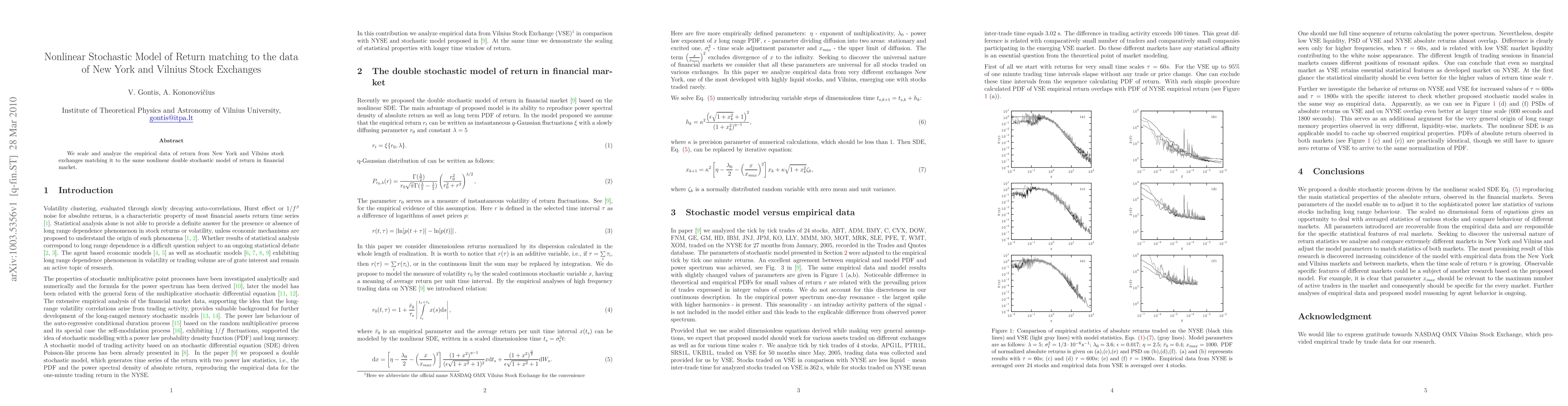 Summary: This paper scales and analyzes return data from New York and Vilnius stock exchanges, fitting it to a nonlinear double stochastic model to understand financial market behavior. The study aims to identify common patterns in the returns of these two markets using a unified model.