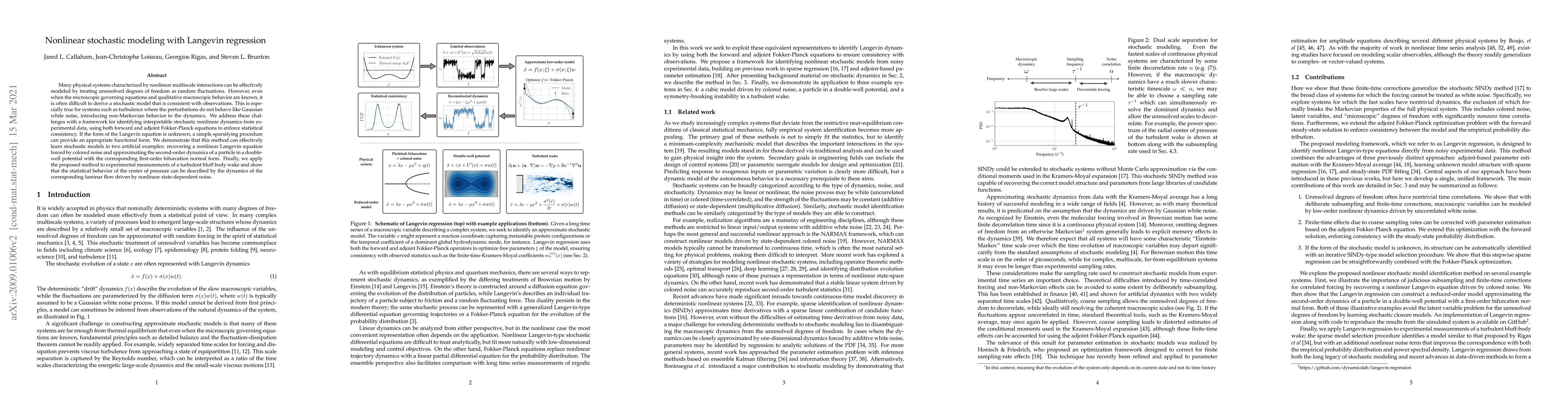 Many physical systems characterized by nonlinear multiscale interactions can be effectively modeled by treating unresolved degrees of freedom as random fluctuations. However, even when the microscopic governing equations and qualitative macroscopic behavior are known, it is often difficult to derive a stochastic model that is consistent with observations. This is especially true for systems such as turbulence where the perturbations do not behave like Gaussian white noise, introducing non-Markovian behavior to the dynamics. We address these challenges with a framework for identifying interpretable stochastic nonlinear dynamics from experimental data, using both forward and adjoint Fokker-Planck equations to enforce statistical consistency. If the form of the Langevin equation is unknown, a simple sparsifying procedure can provide an appropriate functional form. We demonstrate that this method can effectively learn stochastic models in two artificial examples: recovering a nonlinear Langevin equation forced by colored noise and approximating the second-order dynamics of a particle in a double-well potential with the corresponding first-order bifurcation normal form. Finally, we apply the proposed method to experimental measurements of a turbulent bluff body wake and show that the statistical behavior of the center of pressure can be described by the dynamics of the corresponding laminar flow driven by nonlinear state-dependent noise.