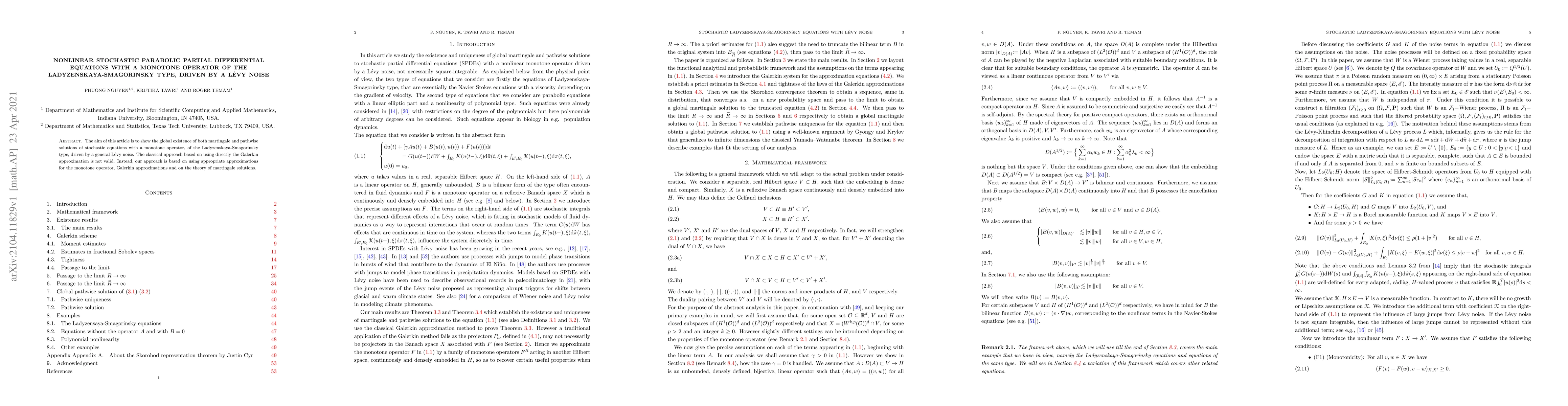 The aim of this article is to show the global existence of both martingale and pathwise solutions of stochastic equations with a monotone operator, of the Ladyzenskaya-Smagorinsky type, driven by a general Levy noise. The classical approach based on using directly the Galerkin approximation is not valid. Instead, our approach is based on using appropriate approximations for the monotone operator, Galerkin approximations and on the theory of martingale solutions.