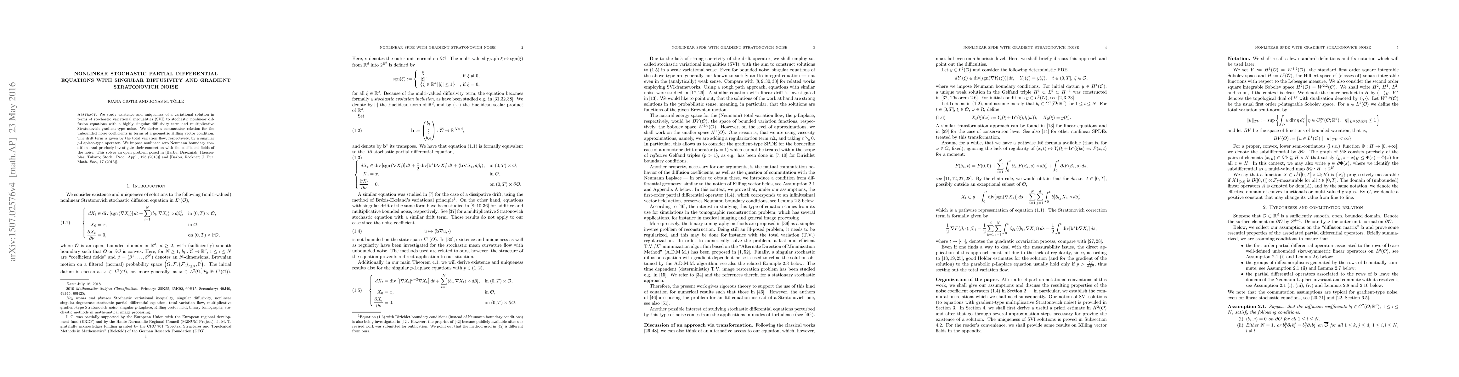 We study existence and uniqueness of a variational solution in terms of stochastic variational inequalities (SVI) to stochastic nonlinear diffusion equations with a highly singular diffusivity term and multiplicative Stratonovich gradient-type noise. We derive a commutator relation for the unbounded noise coefficients in terms of a geometric Killing vector condition. The drift term is given by the total variation flow, respectively, by a singular $p$-Laplace-type operator. We impose nonlinear zero Neumann boundary conditions and precisely investigate their connection with the coefficient fields of the noise. This solves an open problem posed in [Barbu, Brze\'{z}niak, Hausenblas, Tubaro; Stoch. Proc. Appl., 123 (2013)] and [Barbu, R\"ockner; J. Eur. Math. Soc., 17 (2015)].