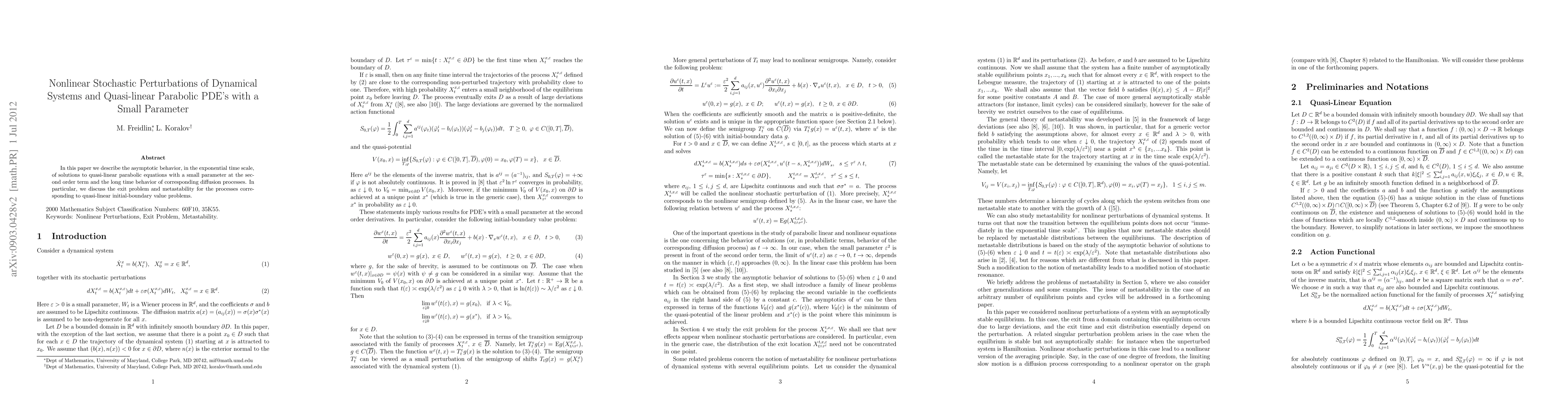 This paper investigates the asymptotic behavior of quasi-linear parabolic PDEs with a small parameter in the second-order term, focusing on their exponential time scale solutions. It also examines the long-time behavior and metastability of associated diffusion processes, particularly addressing the exit problem for these systems.