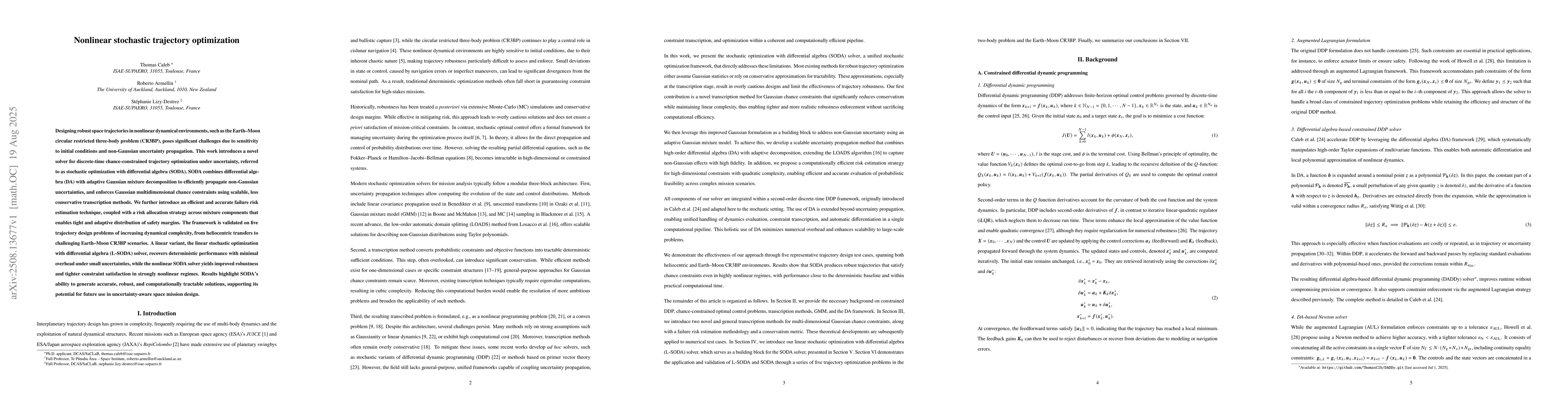 Designing robust space trajectories in nonlinear dynamical environments, such as the Earth-Moon circular restricted three-body problem (CR3BP), poses significant challenges due to sensitivity to initial conditions and non-Gaussian uncertainty propagation. This work introduces a novel solver for discrete-time chance-constrained trajectory optimization under uncertainty, referred to as stochastic optimization with differential algebra (SODA). SODA combines differential algebra (DA) with adaptive Gaussian mixture decomposition to efficiently propagate non-Gaussian uncertainties, and enforces Gaussian multidimensional chance constraints using scalable, less conservative transcription methods. We further introduce an efficient and accurate failure risk estimation technique, coupled with a risk allocation strategy across mixture components that enables tight and adaptive distribution of safety margins. The framework is validated on five trajectory design problems of increasing dynamical complexity, from heliocentric transfers to challenging Earth-Moon CR3BP scenarios. A linear variant, the linear stochastic optimization with differential algebra (L-SODA) solver, recovers deterministic performance with minimal overhead under small uncertainties, while the nonlinear SODA solver yields improved robustness and tighter constraint satisfaction in strongly nonlinear regimes. Results highlight SODA's ability to generate accurate, robust, and computationally tractable solutions, supporting its potential for future use in uncertainty-aware space mission design.