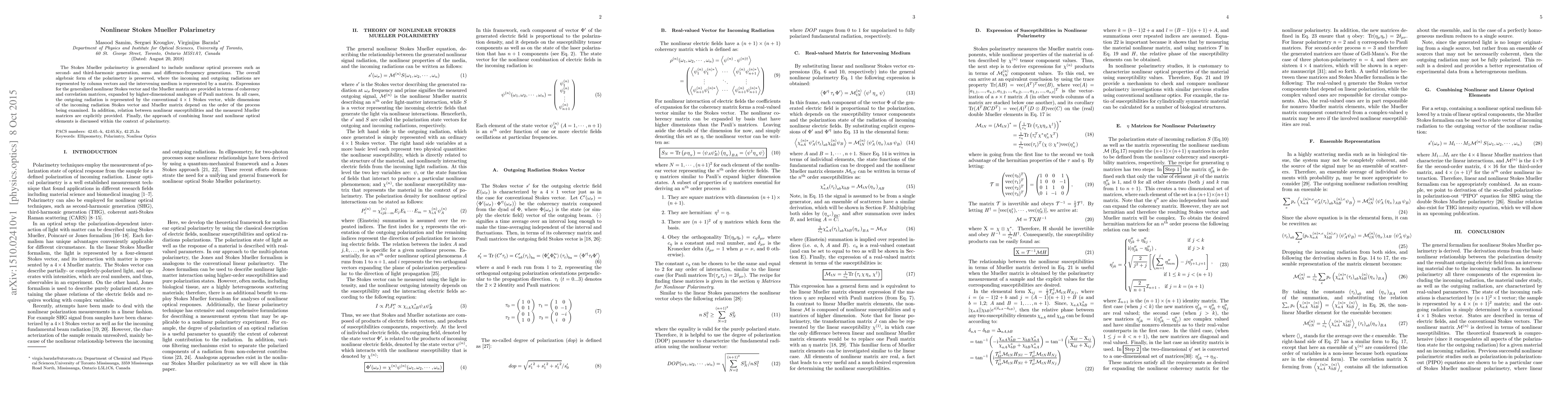This paper generalizes Stokes Mueller polarimetry to include nonlinear optical processes, providing expressions for the generalized nonlinear Stokes vector and Mueller matrix. It discusses the relationship between nonlinear susceptibilities and measured Mueller matrices, and explores the integration of linear and nonlinear optical elements in polarimetry.
