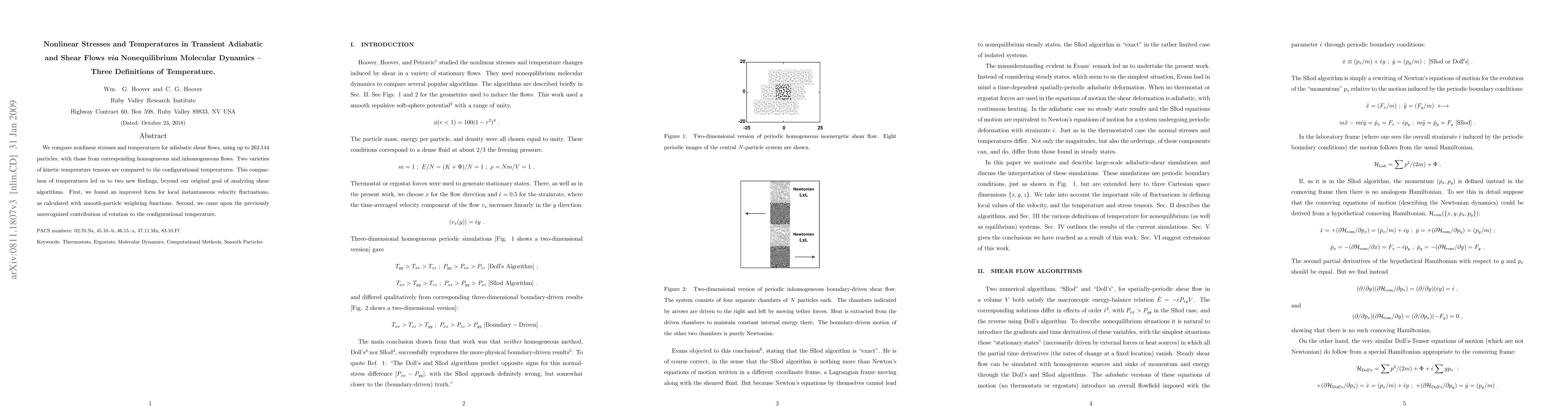 We compare nonlinear stresses and temperatures for adiabatic shear flows, using up to 262,144 particles, with those from corresponding homogeneous and inhomogeneous flows. Two varieties of kinetic temperature tensors are compared to the configurational temperatures. This comparison leads to an improved form for the local and instantaneous smooth-particle averaged stream velocity and to a recognition of rotational contributions to the configurational temperature.
